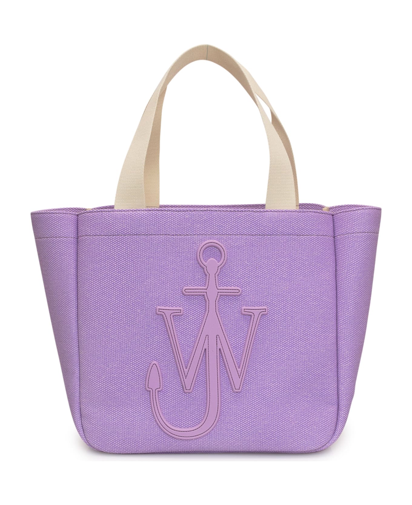 Purple canvas bag. Two handles. Closure with leather laces. Inside pocket. Logo patch on the front.