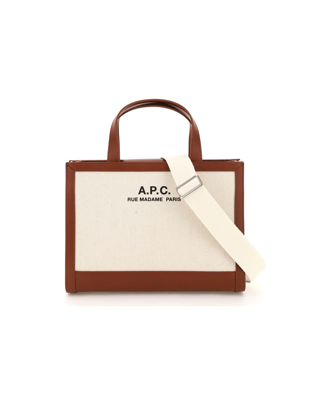 Camille small shopping bag by A. P. C. crafted in cotton and linen blend canvas with smooth leather edges and base. Contrasting logo print on front, leather top handles and adjustable and detachable fabric shoulder strap with leather details. Magnetic closure, unlined interior with a zipped flat pocket, silver-finished metalware.
