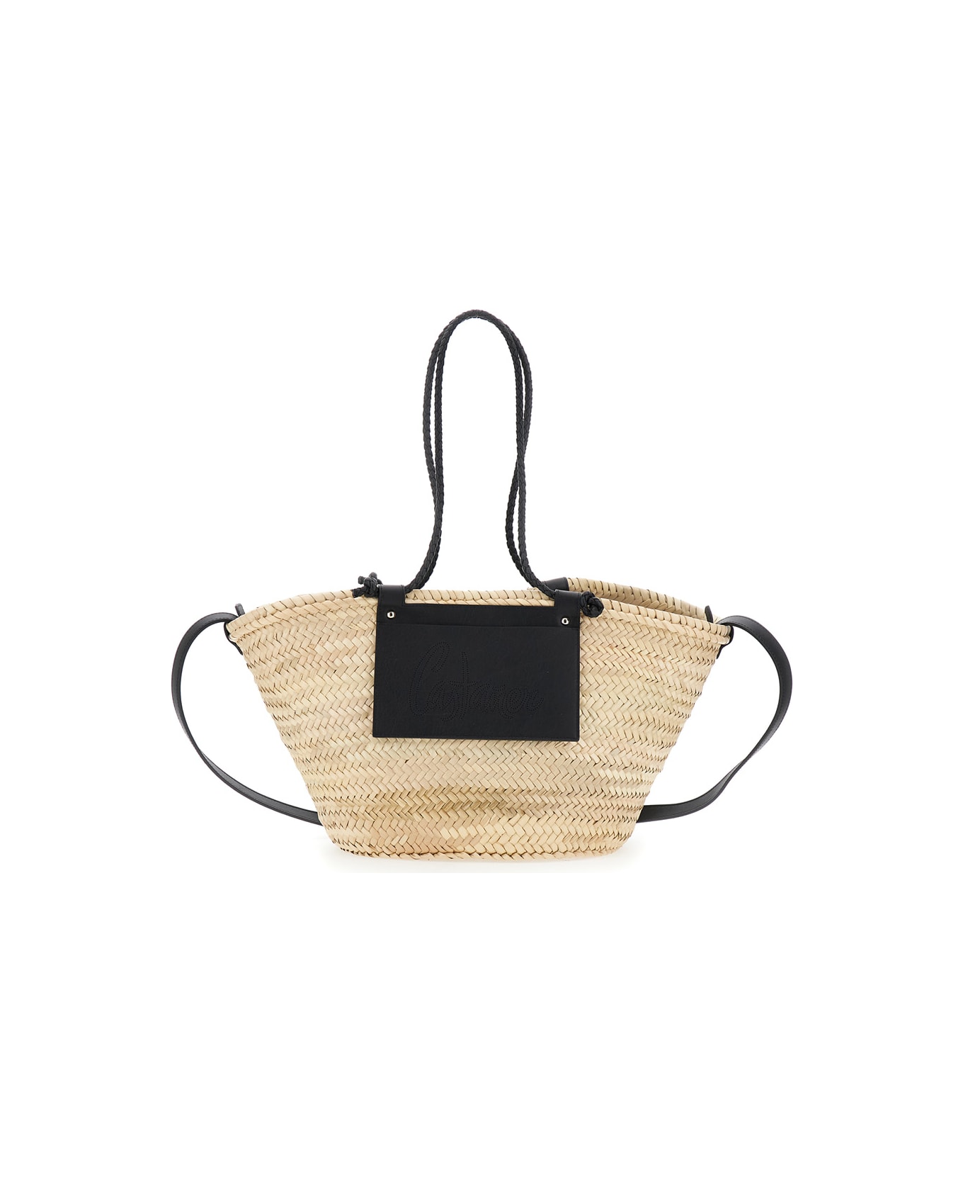 Tote bag Black Two top handles One leather removable shoulder strap Open top Perforated logo lettering on the front Leather panels Rafia Dimensions: 54x28x16 cm