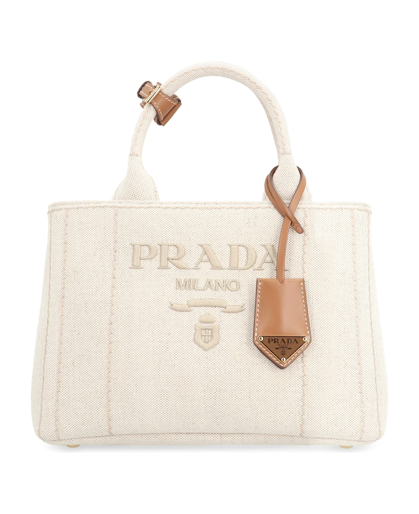 Canvas item with leather details leather charm with logo one open compartment internal zippered pocket internal flat pocket fabric lining adjustable and removable fabric shoulder strap protective bottom metal studs gold-tone metal hardware width: 26 cm height: 18 cm depth: 15 cm strap: 108 cm 58% cotton, 42% linen, 100% calf Composition: 58% % Cotton, 42% % Linen, 100% % Calf