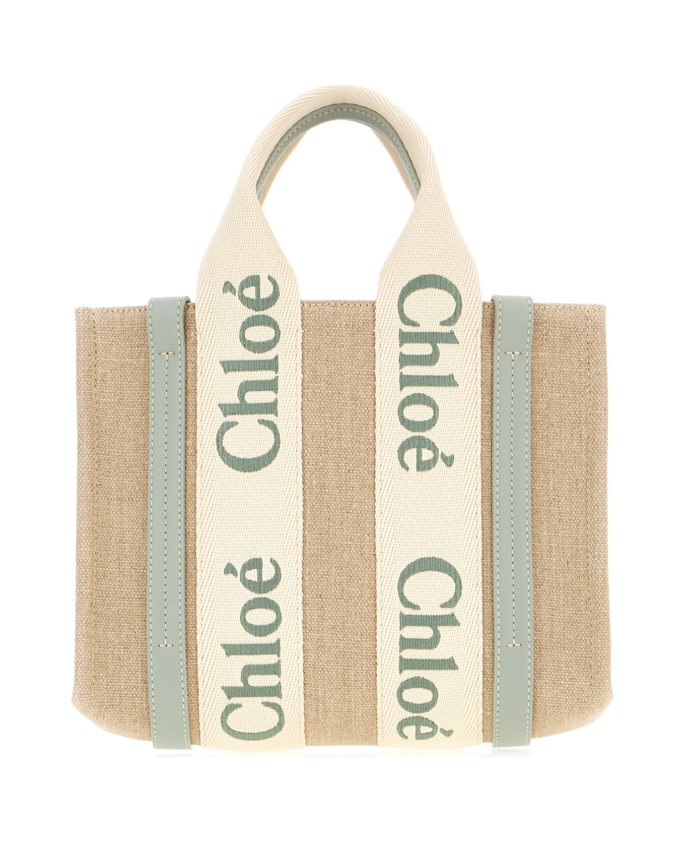 Handbag realized in linen enriched by Woody ribbon and contrasting leather inserts. -Contrasting Woody ribbon handles -Adjustable detachable contrasting leather shoulder strap -Lined interior with a patch pocket Composition: Exterior: 100% Linen