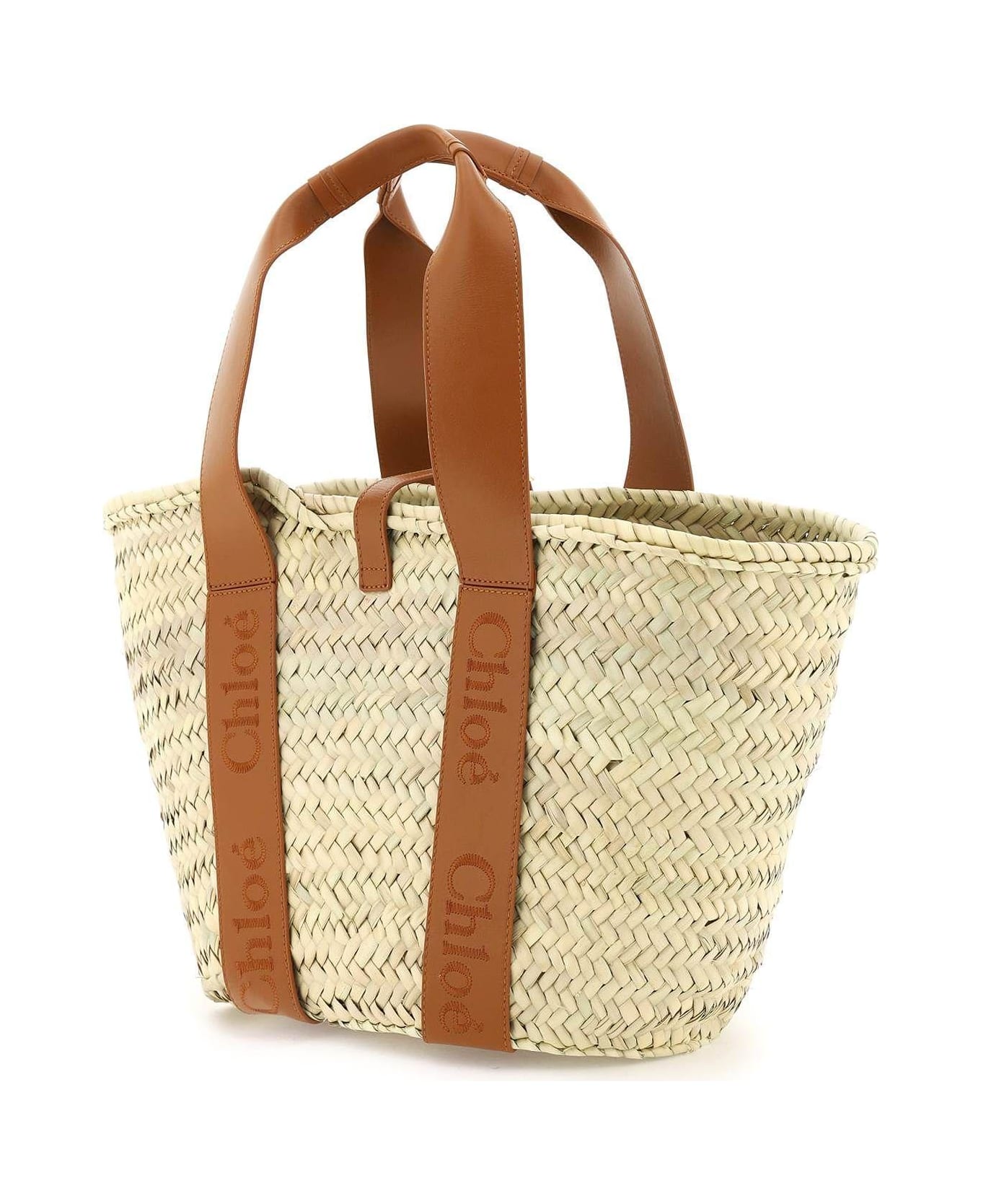 Chloé panier bag made of woven straw and featuring leather bands with tone-on-tone embroidered lettering logo. Double handles and adjustable buckle closure. Composition: 100% Sw 100% Calf Leather