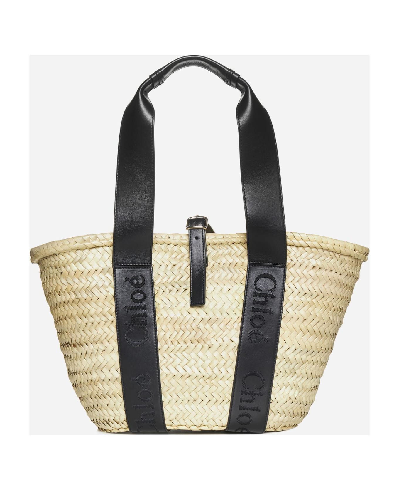 Chloe' Sense medium bag in woven raffia featuring black leather top handles and logo-tape bands and an adjustable strap fastening with gold-tone metal buckle. Composition: 100% natural fibers