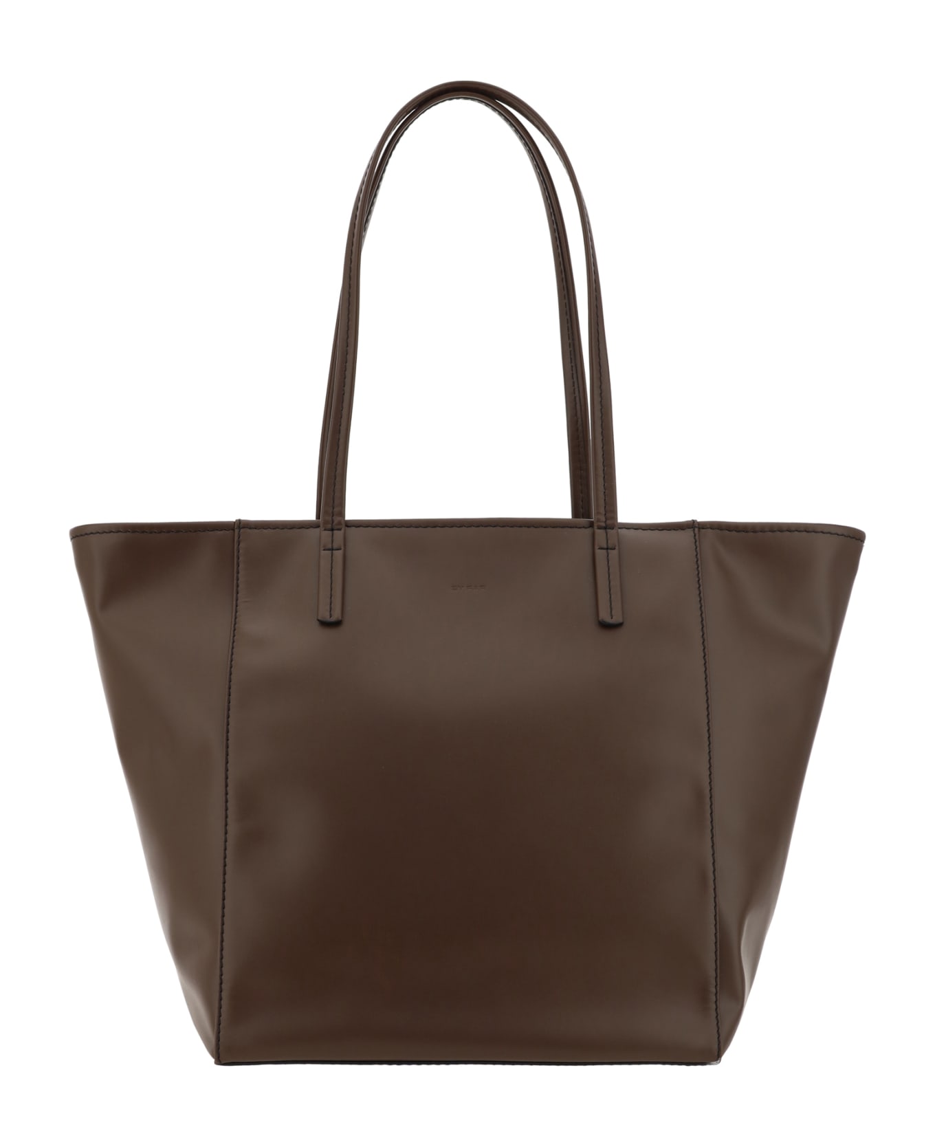 Calfskin club tote shoulder bag by by far, two top handles, single interior compartment, matching removable pouch, iconic brand logo press-stamped on front.
