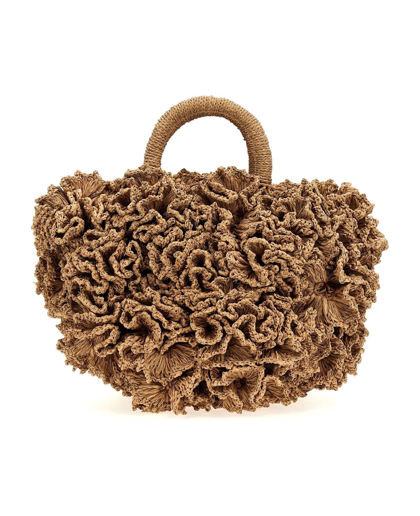 'Coral' crocheted raffia handbag with 3D decorations, drawstring bag closure, double fixed handle, removable leather shoulder strap. Composition: 100% raffia