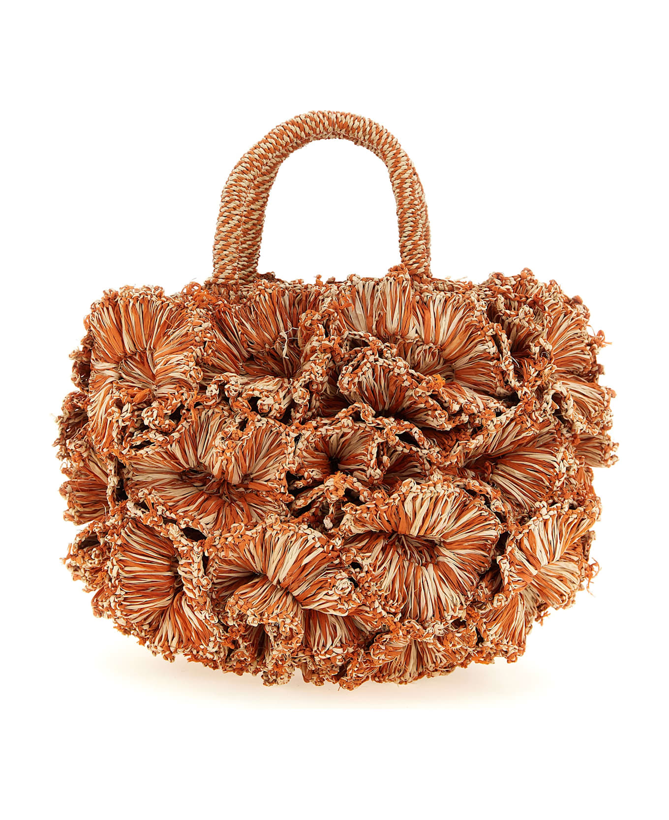 'Coral' crocheted raffia handbag with 3D decorations, drawstring bag closure, double fixed handle, removable leather shoulder strap. Handcrafted product, any imperfections are to be considered characteristics of uniqueness. Composition: 100% raffia
