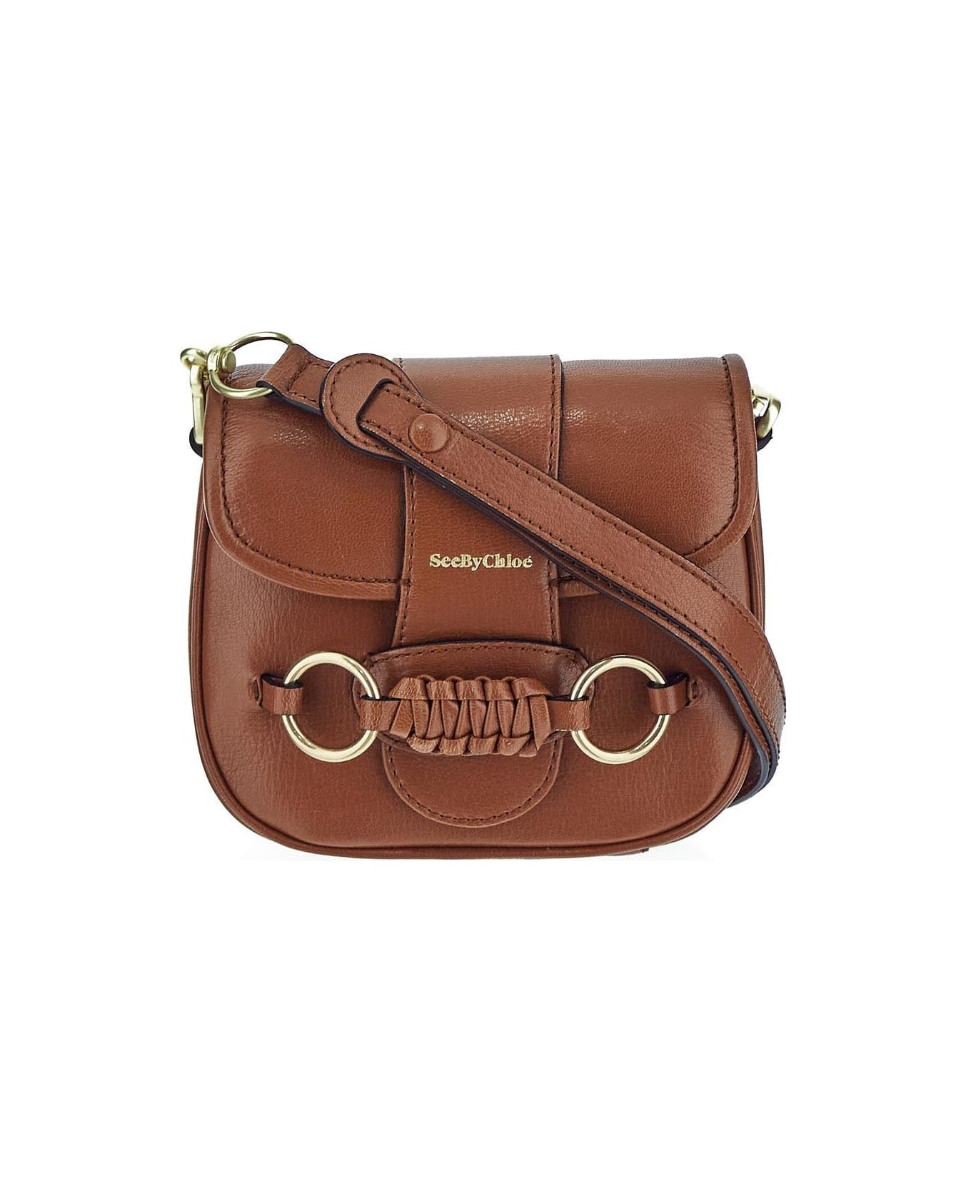 See By Chloé shoulder bag in caramel goatskin featuring one main compartment with smartphone pocket, magnetic flap closure, gold brass hardware, braided finish leather decoration at front, adjustable/removable shoulder strap and gold-toned front logo.