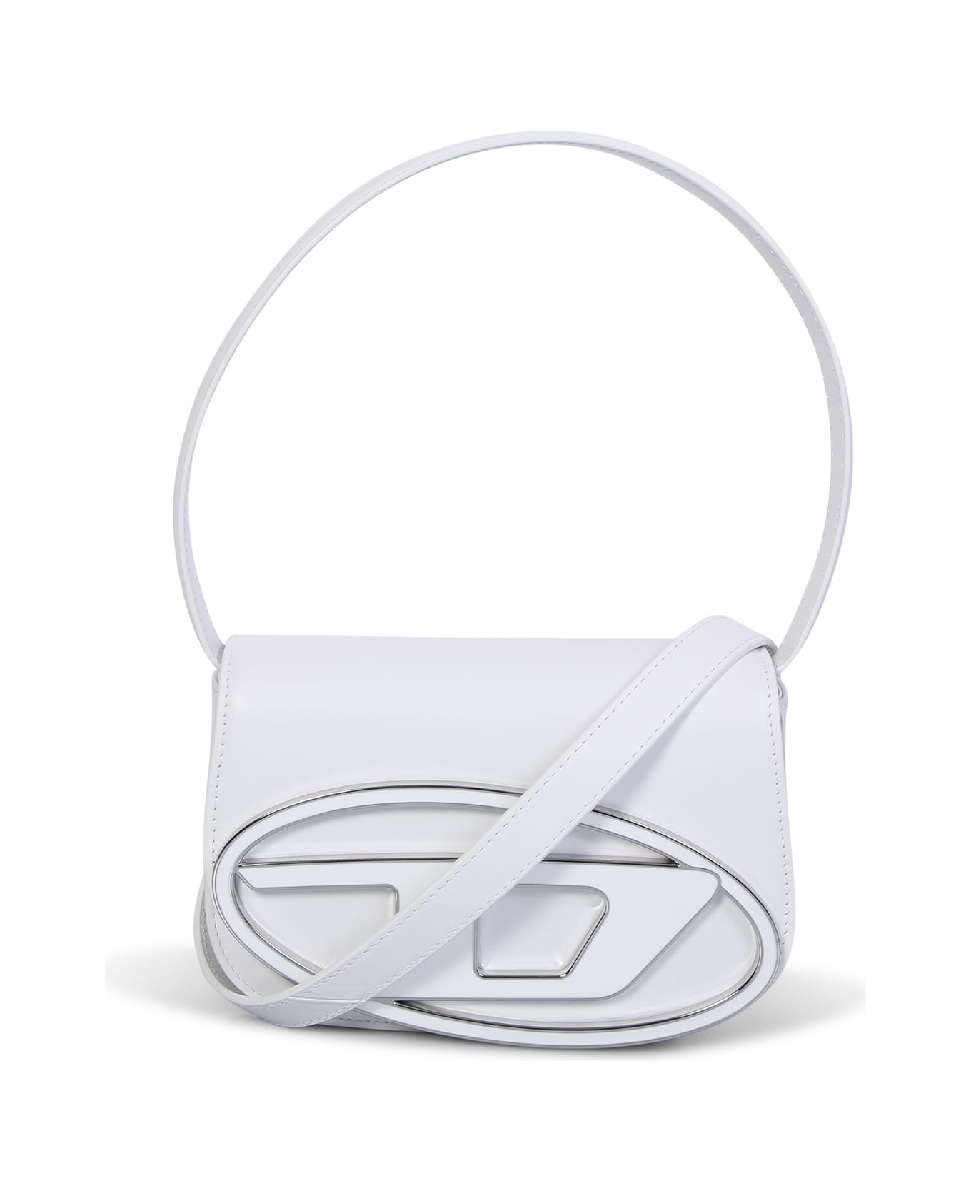 Logo plaque. Magnetic fastening. Partitioned compartment. Signle rounded top handle. Color: white