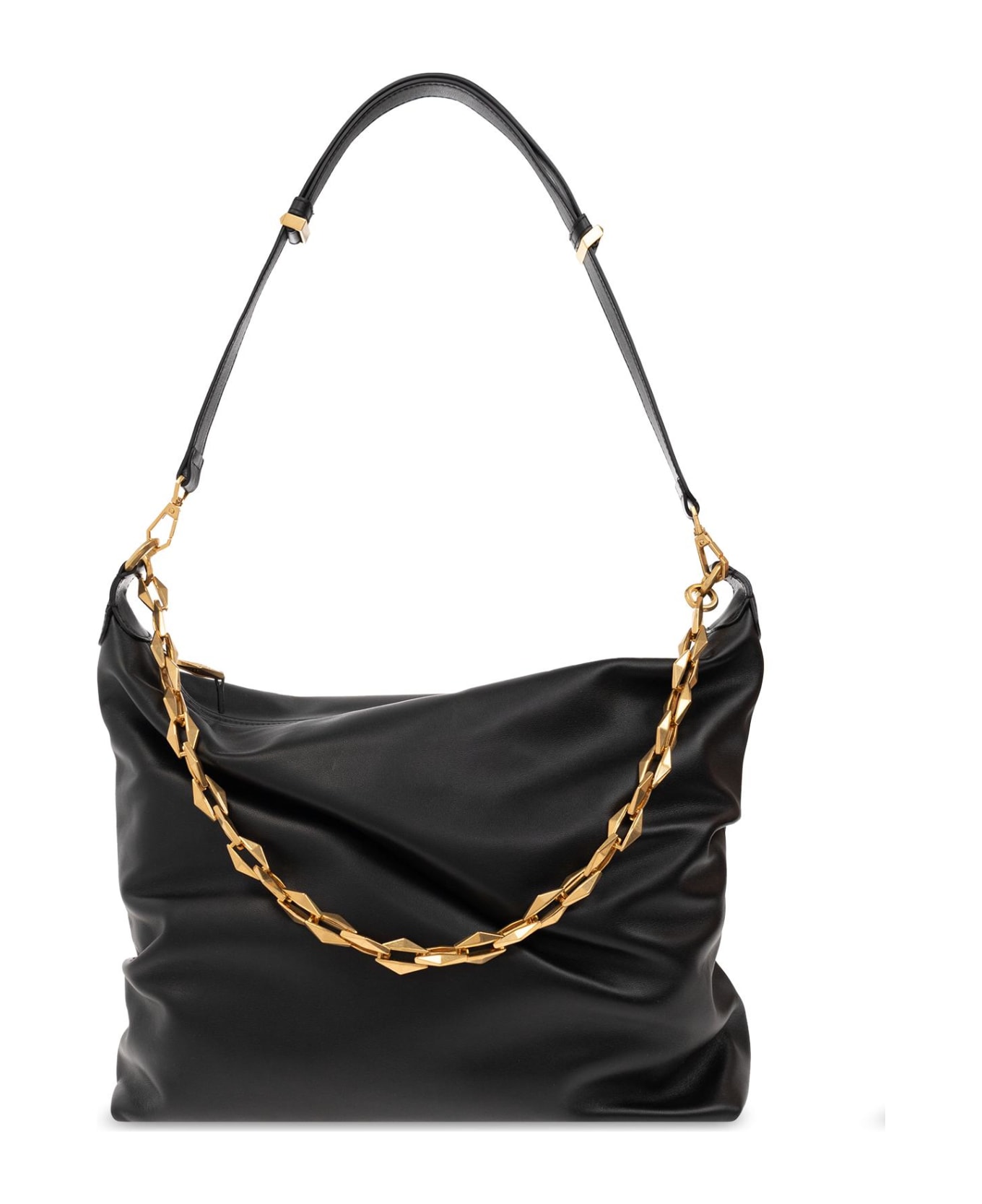 Black 'Diamond Soft Medium' shoulder bag from Jimmy Choo. Crafted from leather, this design secures with a zip and showcases a printed logo on the front. It is complete wit a diamond-inspired chain strap, one detachable shoulder strap, gold-tone metal har