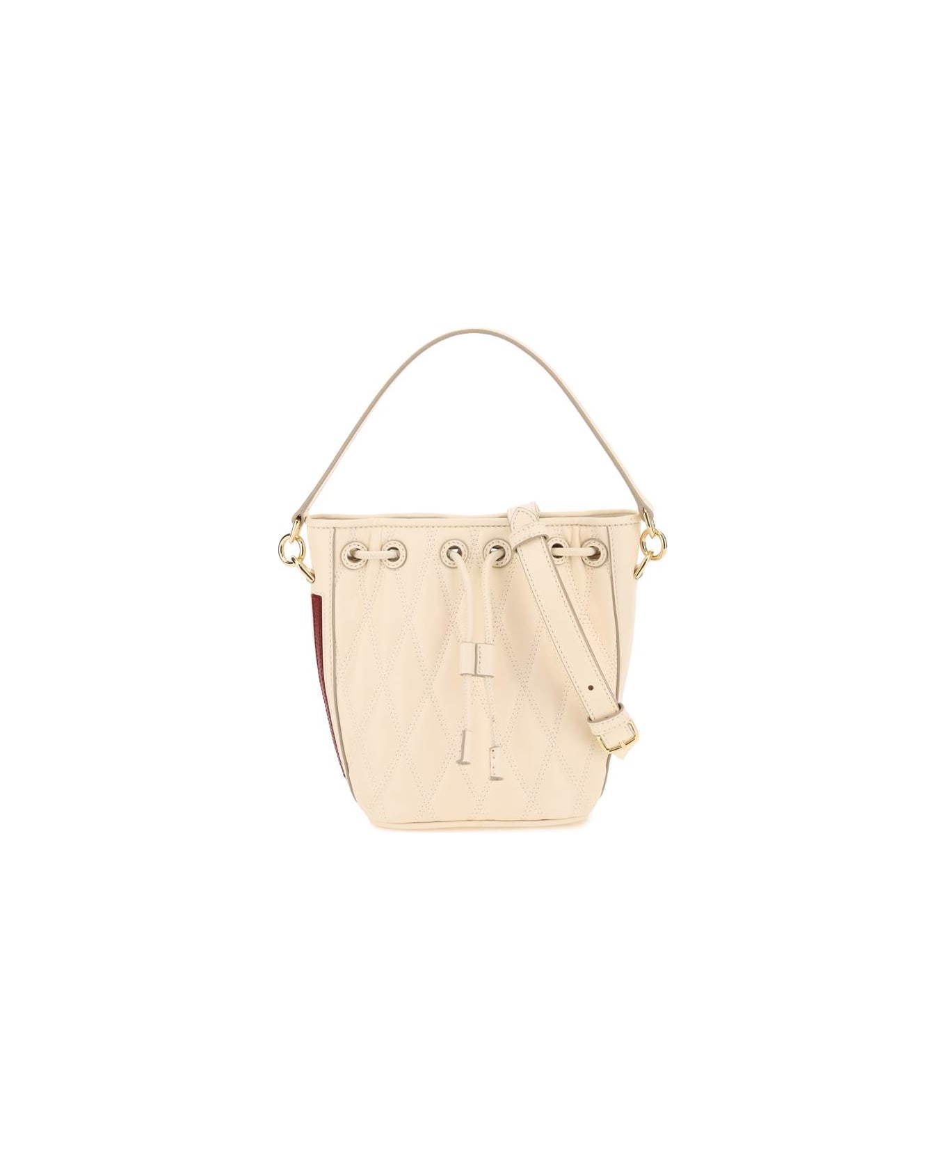 Donae bucket bag by Bally crafted in diamond-quilted nappa leather with Bally Stripe detail and metal lettering logo on one side. Top handle, adjustable and detachable shoulder strap, drawstring closure, branded fabric lining and two inner open flat pockets. Gold-finished metalware.