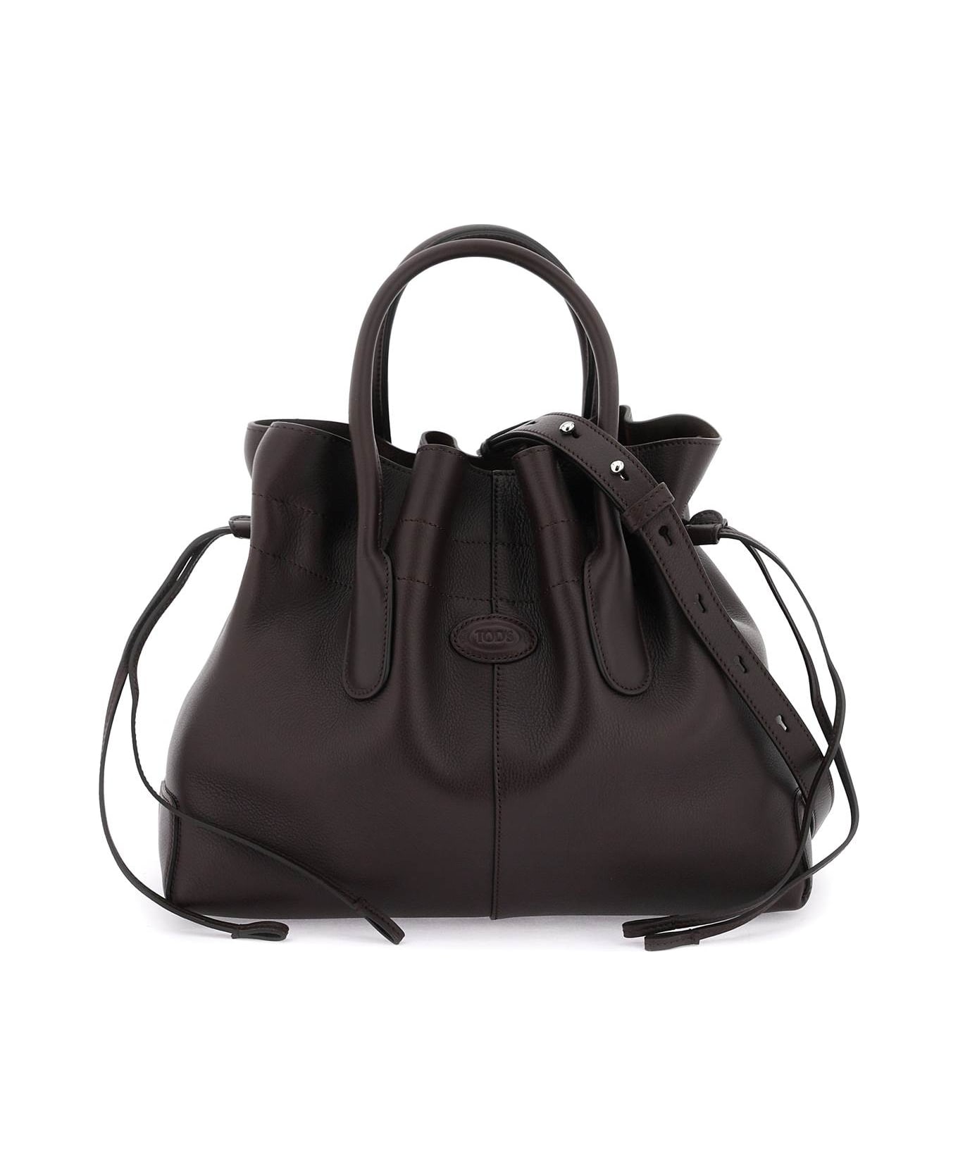 Tod's handbag made of soft grained leather with tone-on-tone topstitching and drawstring closure. Double top handle, suede interior, adjustable and removable leather strap. Finished with embossed logo on the front, protective studs at base, silver-finished metalware. Equipped with matching pouch.