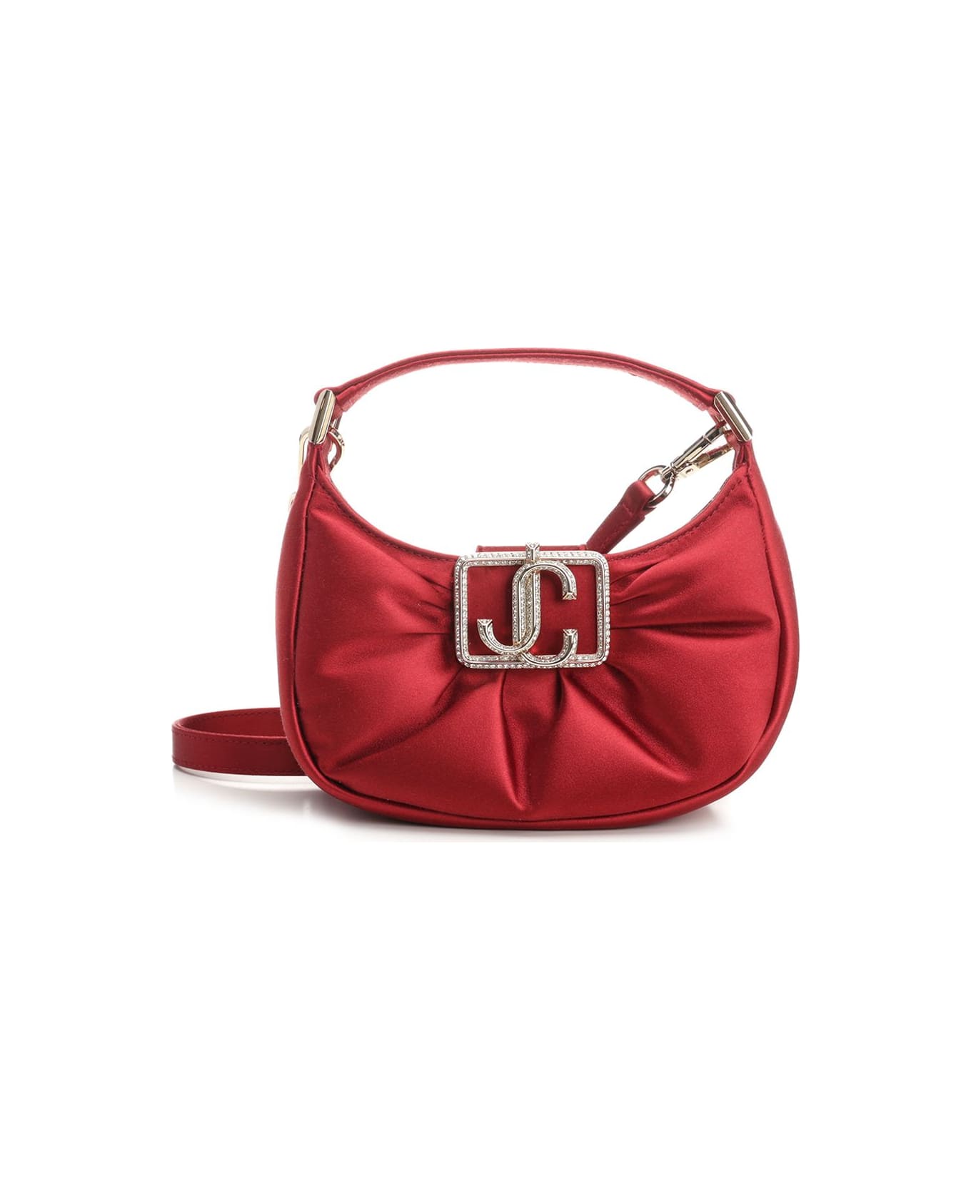 "Edie Hobo Mini" padded red satin with metallic effect bag by Jimmy Choo. Crystal embellished monogram frame decoration. Removable shoulder strap. Fabric lining. Light gold hardware. Composition: 90% SATIN 5% CRYSTAL 5% BRASS