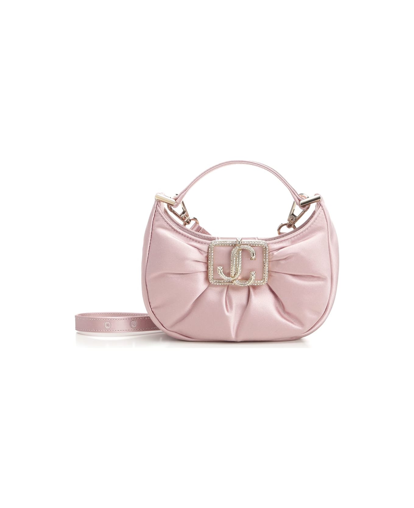 "Edie Hobo Mini" padded red satin with metallic effect bag by Jimmy Choo. Crystal embellished monogram frame decoration. Removable shoulder strap. Fabric lining. Silver hardware.