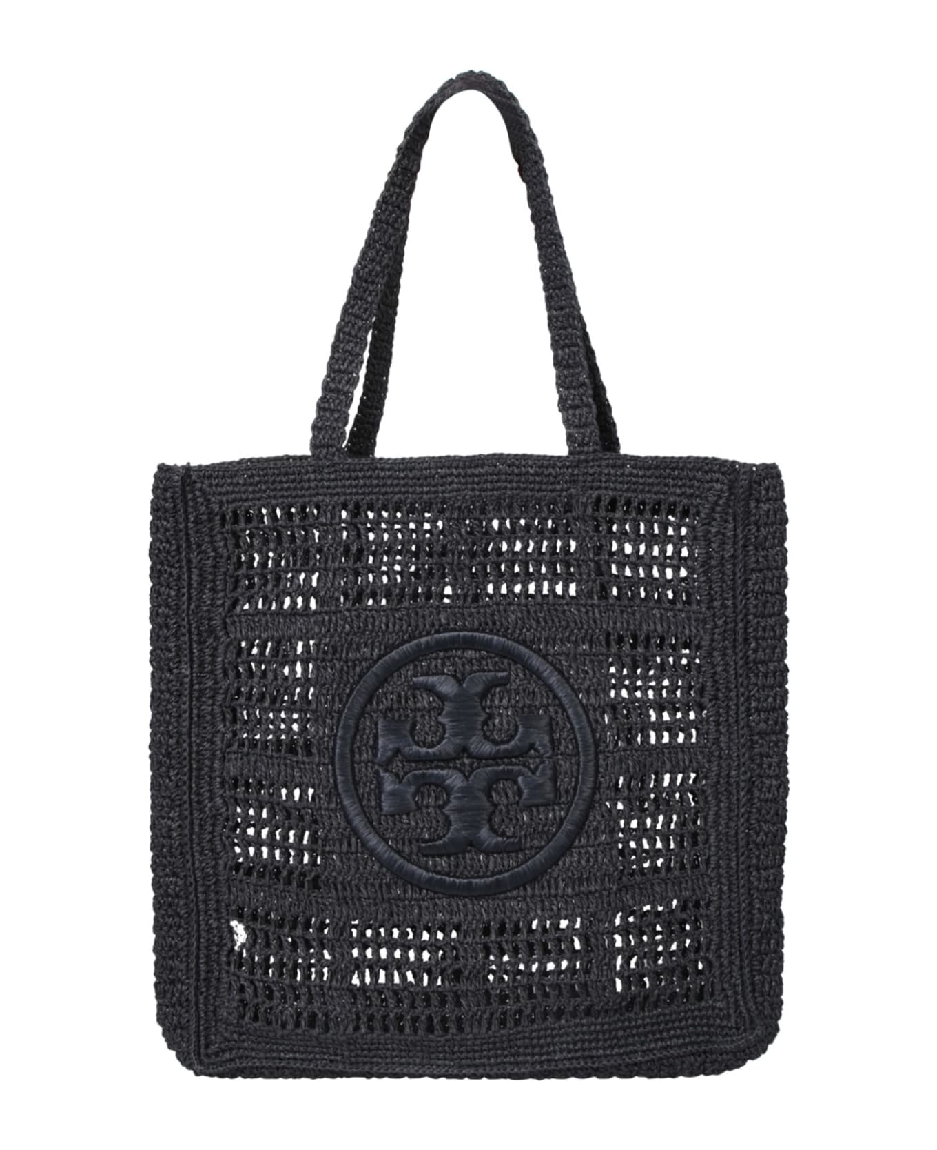Two top handle. Open top. Crochet knitted. Embroidered logo to the front. Color: black