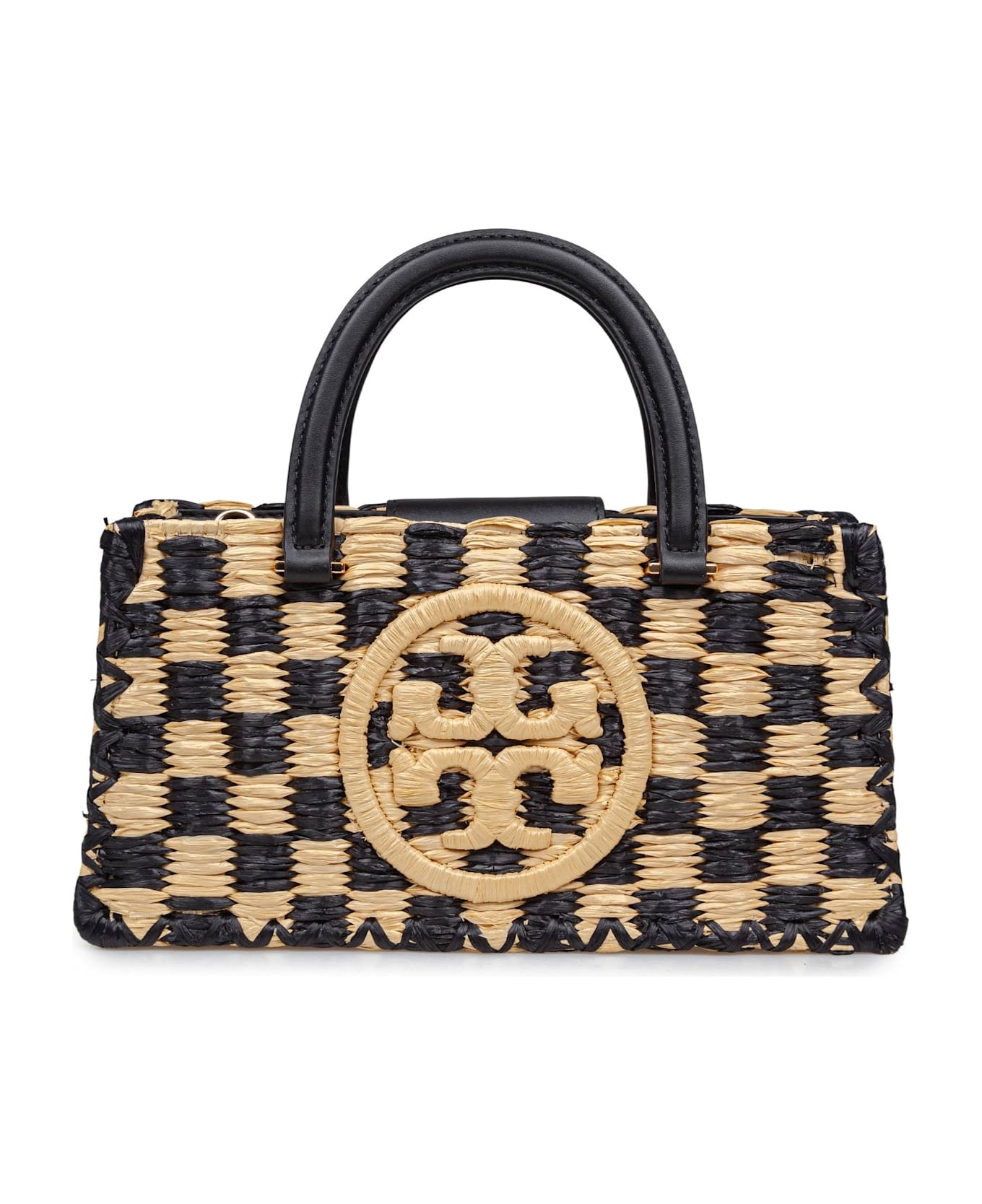 Raffia handbag natural and black color hand crocheted raffia magnetic snap closure bridge top handles adjustable and removable shoulder strap one internal front slit pocket one internal back zip pocket hand crochet technique measurements: width 26. 7cm height 13. 5cm depth 6cm external composition: 100% raffia external leather details made in india