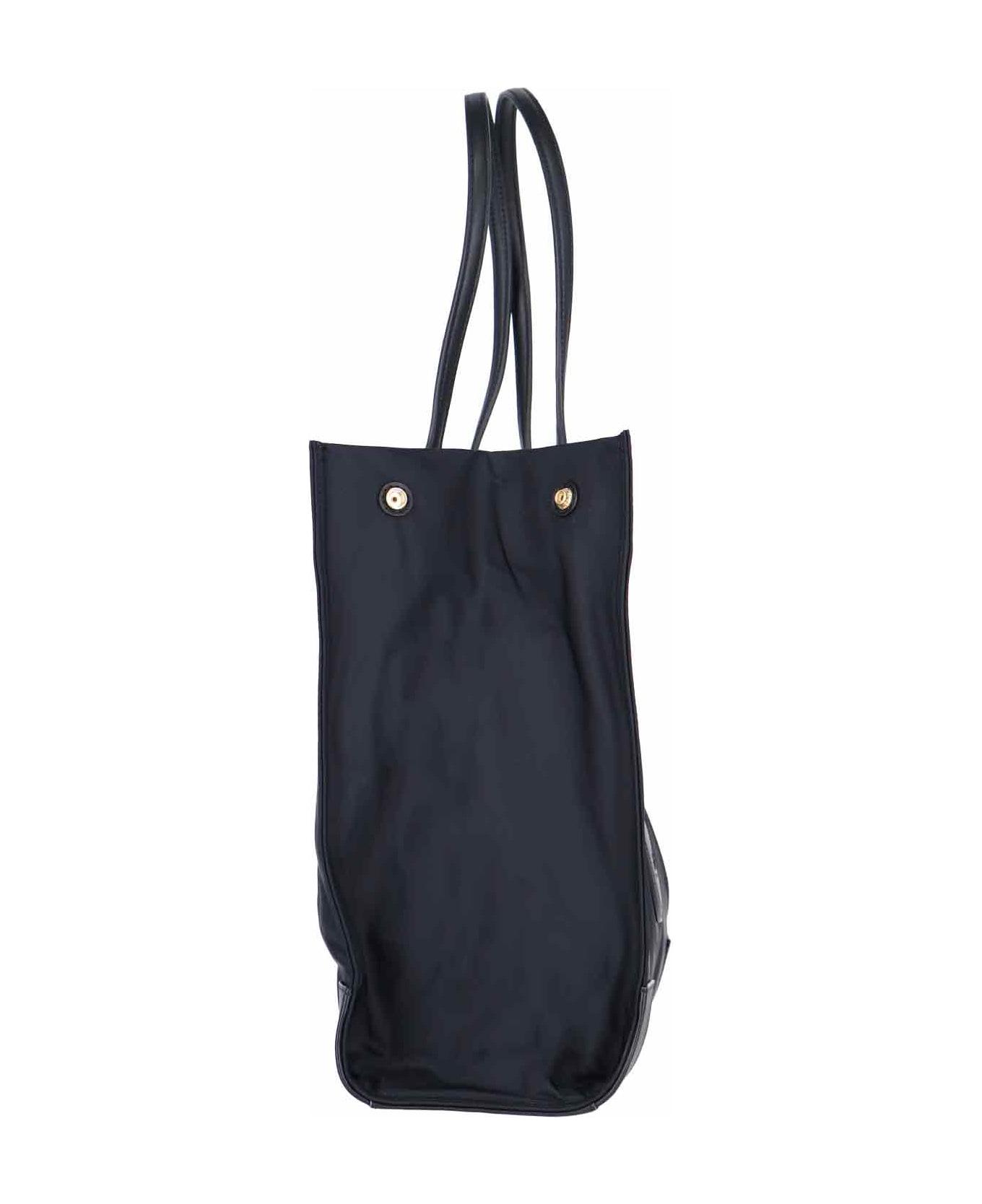 Tory Burch Ella large tote bag, in recycled blue nylon, navy tone, black faux leather details, two top handles, double 'T' logo patch on front, adjustable press studs on side, magnetic closure, one main internal compartment, one internal zip pocket, one internal flat pocket.