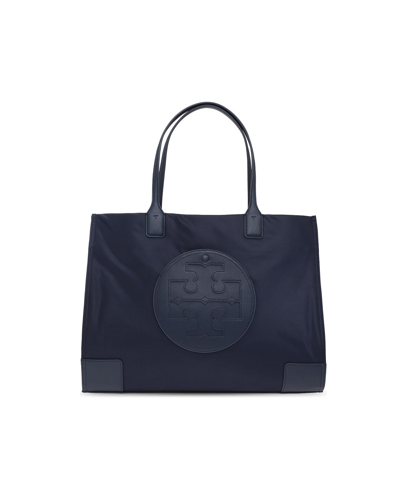 Navy 'Ella' shopper bag from Tory Burch. Made of durable, recycled nylon, this model features a magnetic snap, logo detail, two half-round handles and one internal compartment with one zip pocket and one slip pocket.