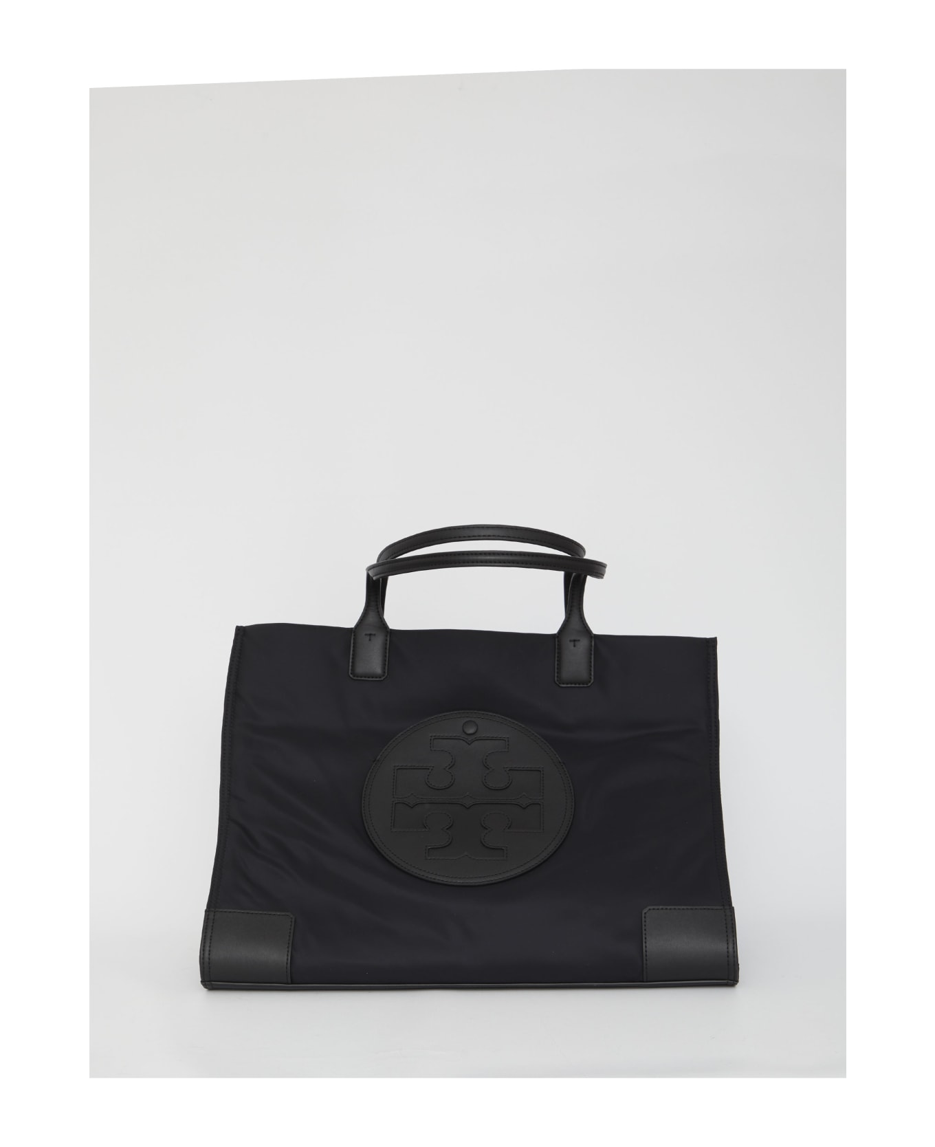 Ella Tote bag in black nylon with black leather inserts. It features embossed Double T logo on the front, fixed double handles, magnetic tab closure, one main interior compartment, one interior zip pocket and one interior slip pocket. Side snap-buttons.