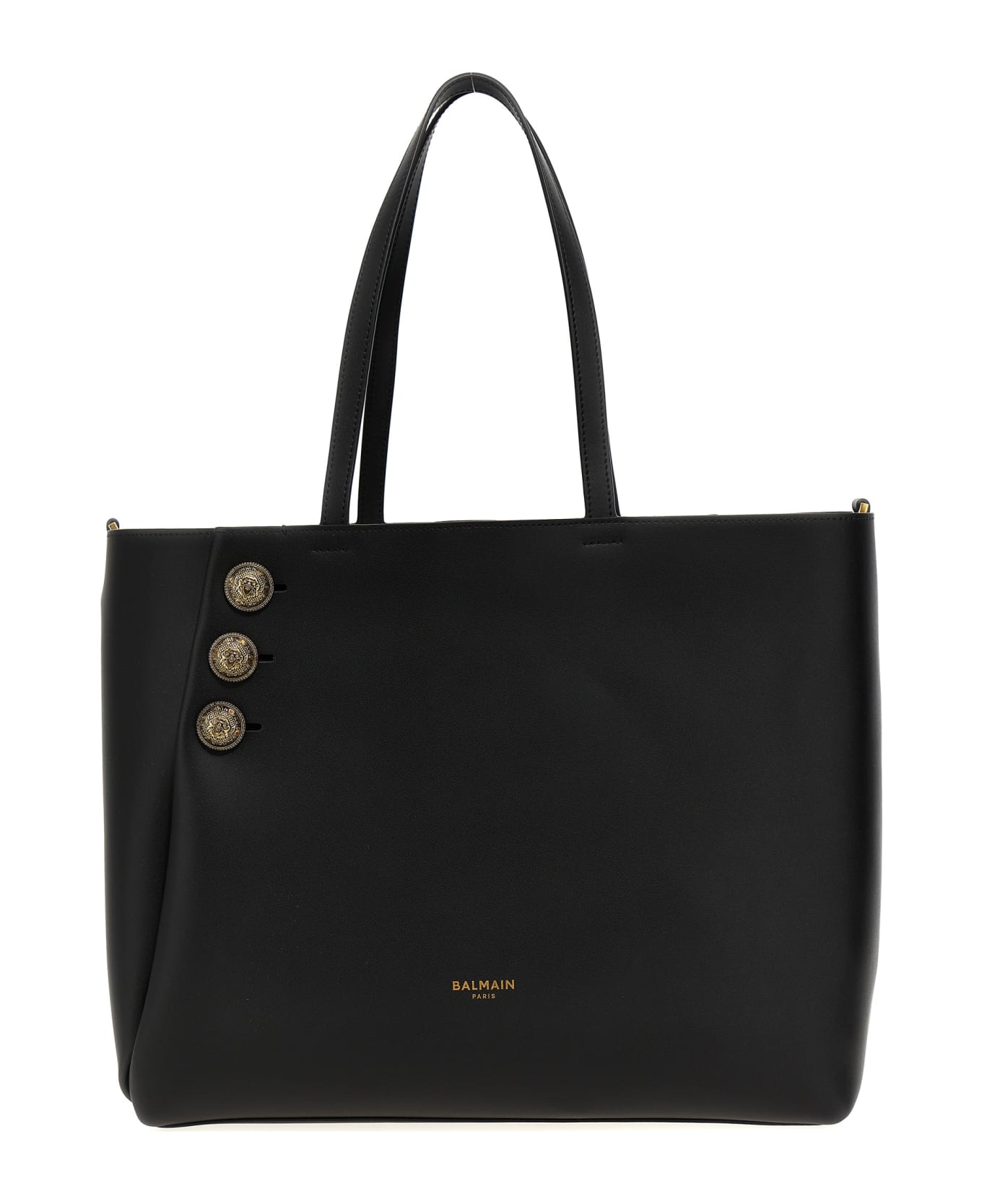 'Emblème' leather shopping bag with three front gold logo buttons. Model equipped with internal clutch.