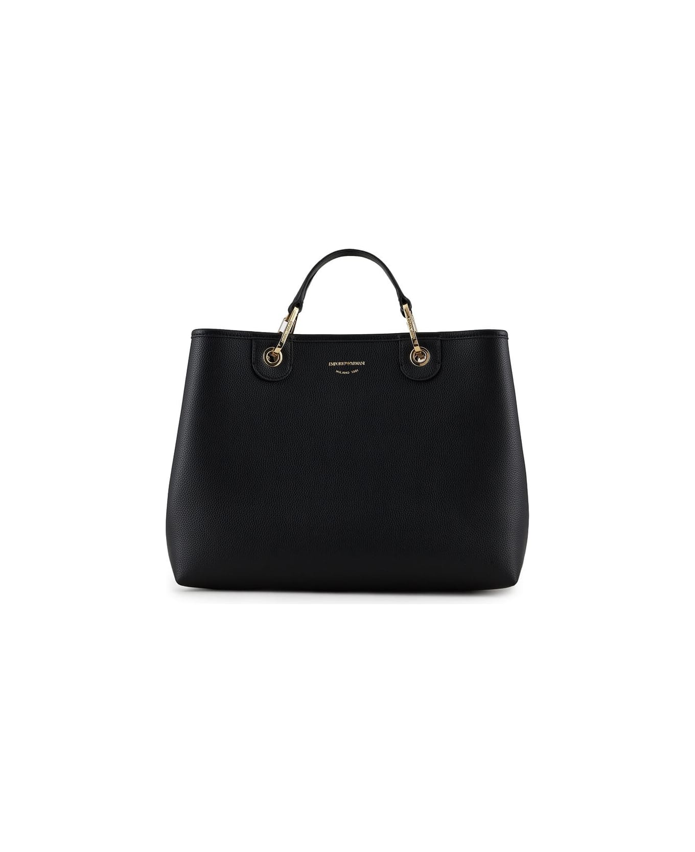MyEA shopping bag by Emporio Armani made of black faux leather. Roomy interior with removable clutch bag, front logo and magnetic closure. Adjustable and removable logoed fabric shoulder strap, measures 37. 5x27x11. 5 cm.