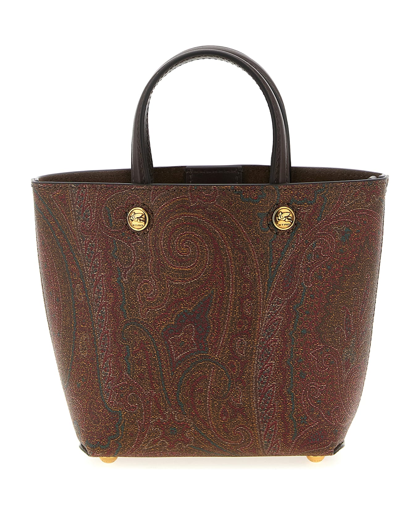 'Etro Essential' mini shopping bag in matt-grain coated Paisley jacquard cotton fabric with canvas doubling, double fixed leather handle with engraved logo button detail, magnetic closure, adjustable and removable leather shoulder strap.