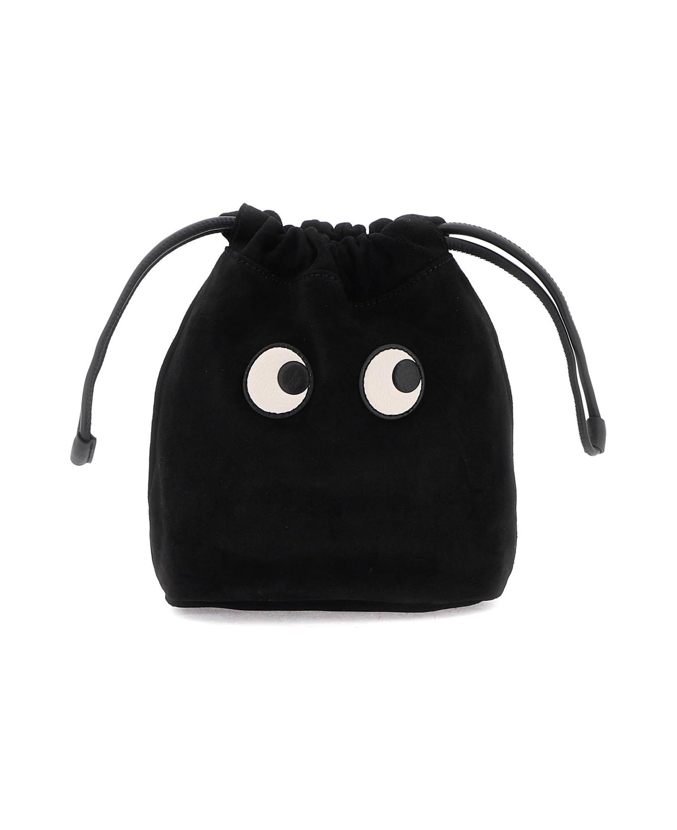 Mini bucket pouch by Anya Hindmarch in suede leather and characterized by the iconic "Eyes" patch on the front. Drawstring closure that doubles as a double handle, suede interior, finished with gold-tone metal bow at back.