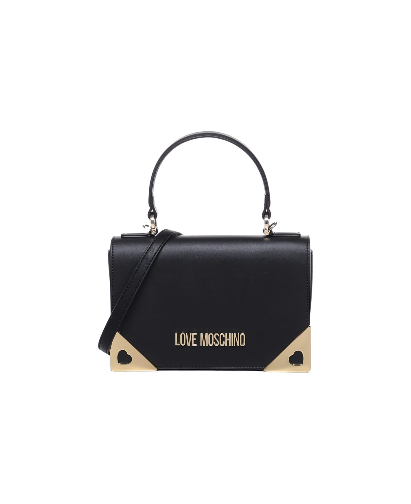 Black Florence Handbag from Love Moschino -Flap with metal corners with hearts -Metal lettering logo on the front -Soft handle -Removable shoulder strap -Magnetic closure -Lined interior with pocket -Measurements: 23x15x7 cm -Made in Italy -Colour: Black -70% Calfskin, 30% Polyurethane
