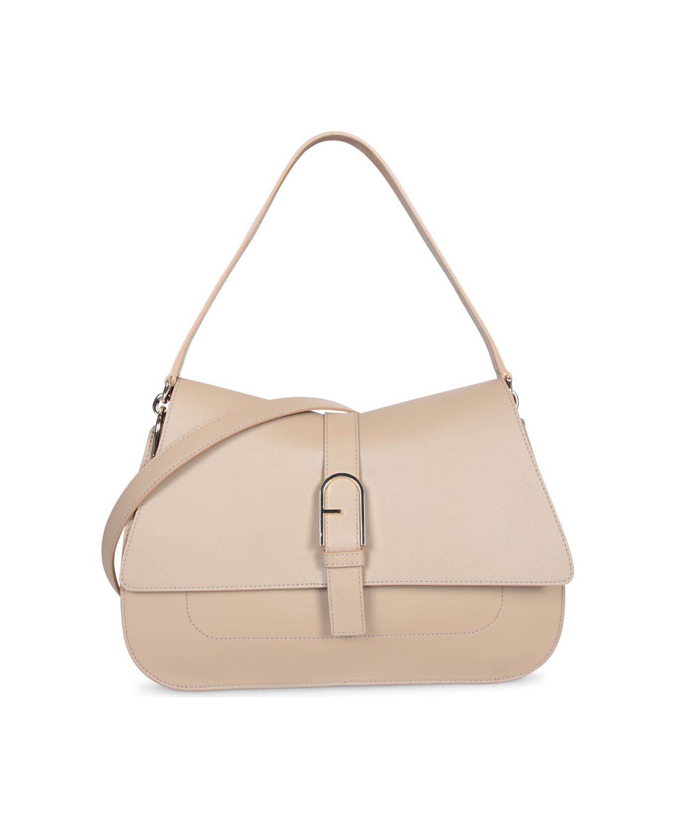 This elegant greige leather Furla bag, Flow L model, combines functionality and sophistication. It features a spacious internal pocket and subtle metal details for a touch of elegance.