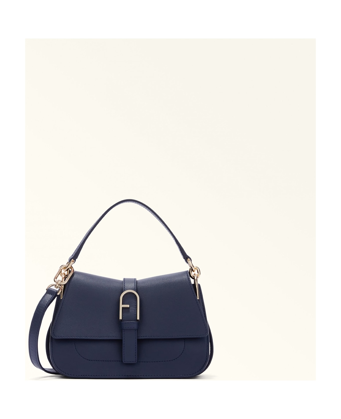 Leather handbag blue color short top handle in leather long adjustable and removable leather shoulder strap flap closure with magnetic button punched furla logo one open flat pocket material: claris lux calfskin maximum length of the shoulder strap 111 cm minimum length of the shoulder strap 98 cm furla arch seal internal composition 50% nylon 50% polyurethane external composition 100% leather measurements: width 21. 5cm height 15mc depth 8 cm made in bg