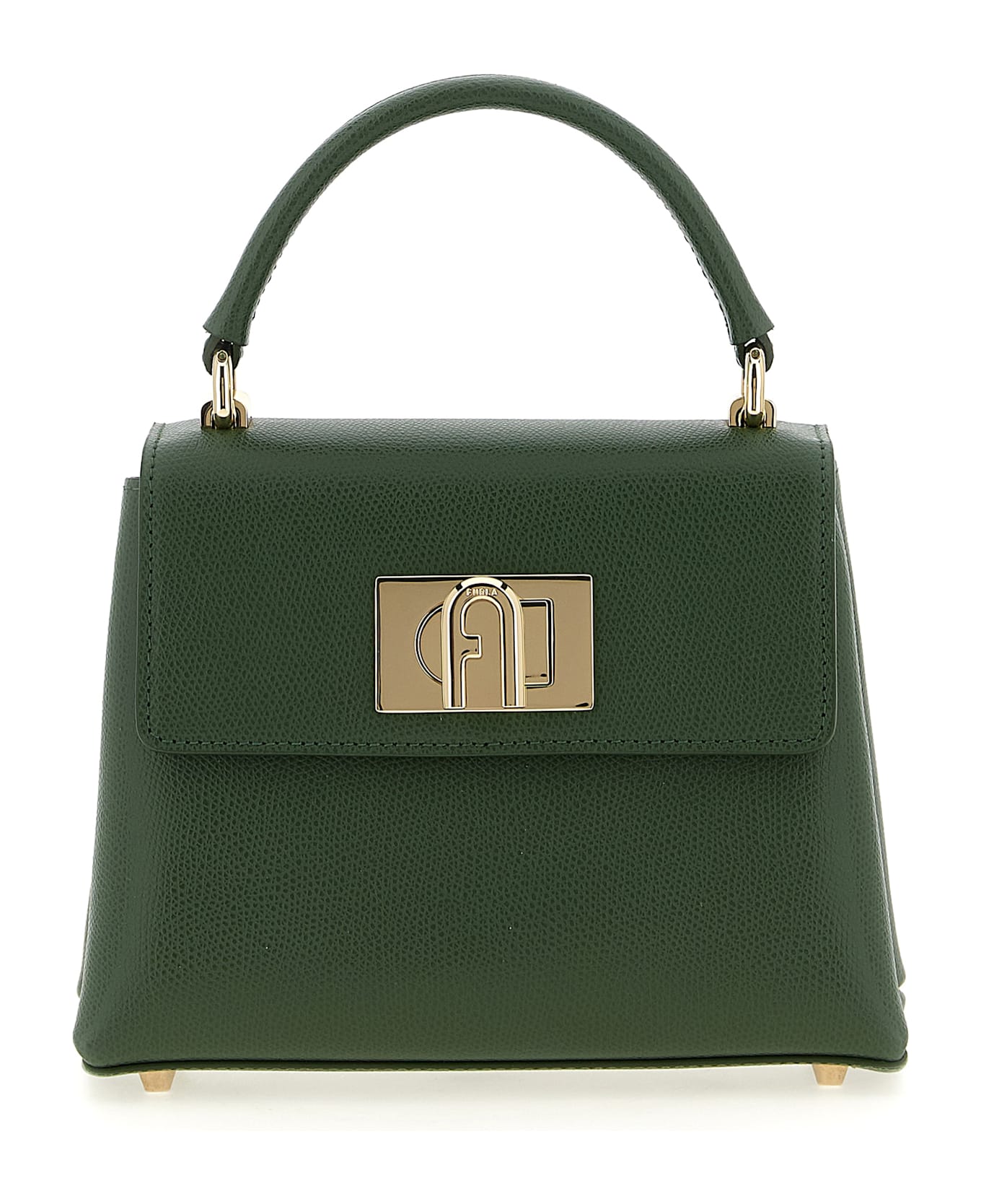 'Furla 1927' mini leather handbag with a light garnet texture, interior gusset construction, flap closure with metal spin with Arco logo, fixed handle, back pocket, metal details, removable chain shoulder strap.
