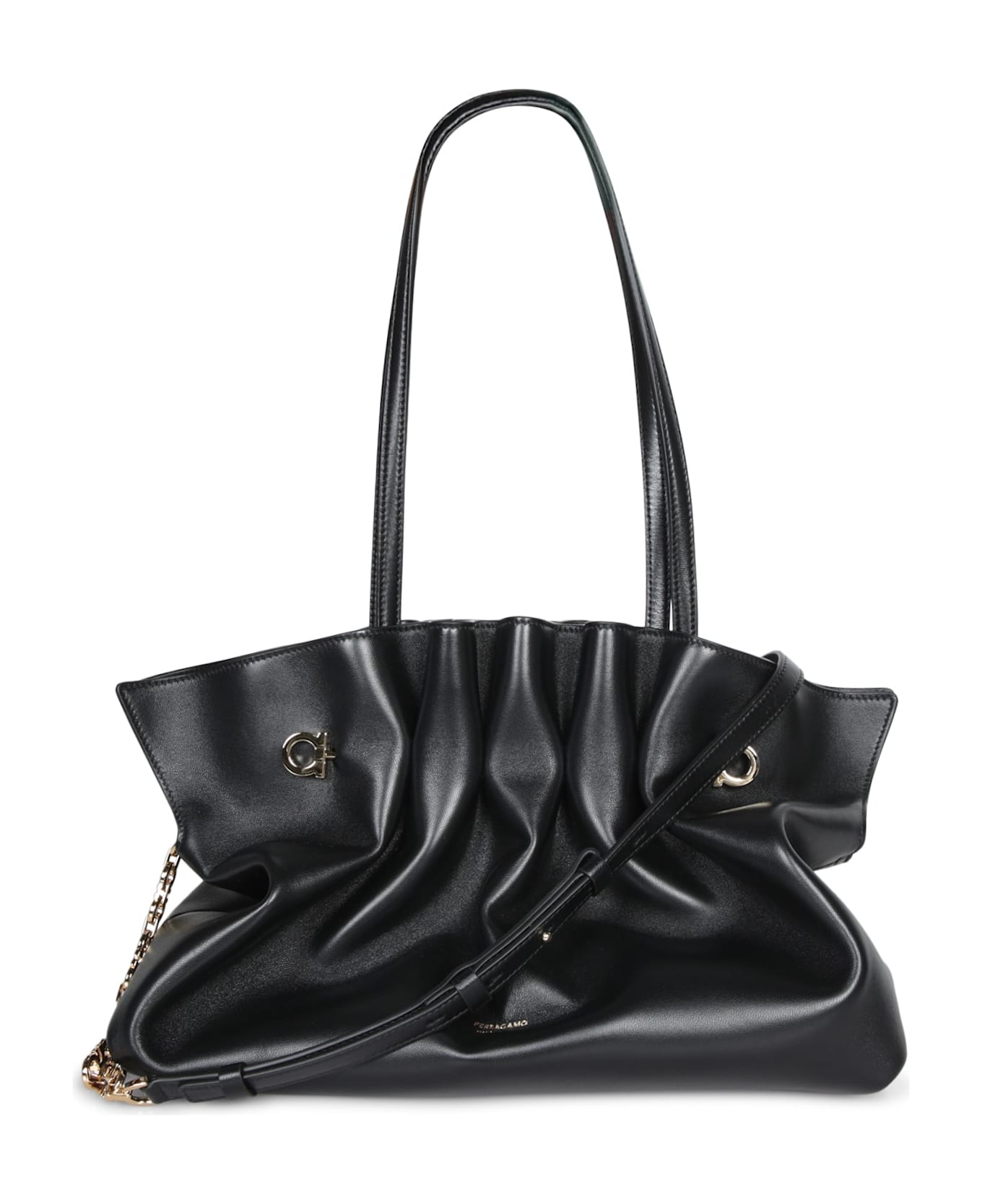 Elegant Ferragamo black leather bag enhanced with golden piercing details, perfect for a sophisticated look. Spacious interior with an optional shoulder strap for unmatched versatility. Composition: 100% Lamb Leather