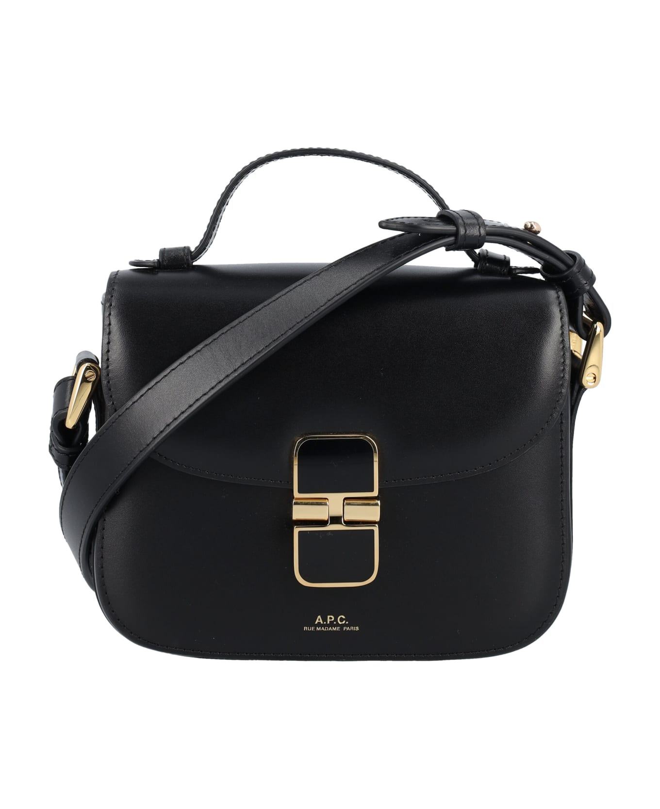 Smooth Leather Grace Mini Top Handle Bag By A. p. c.. Featuring: Top Handle Adjustable Leather Shoulder Strap Goldtone And Black Hardware Clasp Flap Lined In Cowhide Suede Split One Large Compartment Two Large Pockets Two Goldtone Rings On The Sides Goldtone Logo Print Width: 17 Cm Height: 13 Cm Depth: 4 Cm
