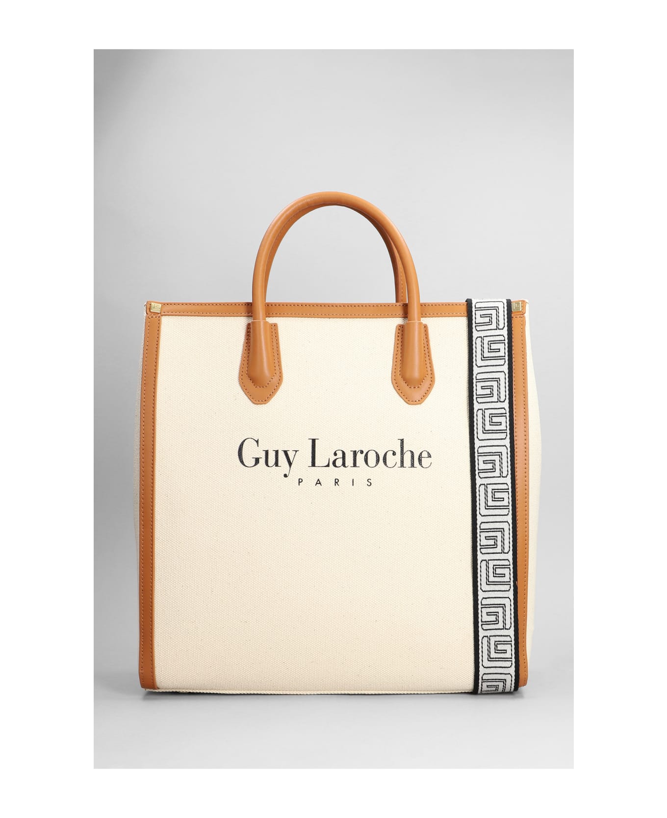 Hand bag in beige canvas, Height 355 mm, Width 350 mm, Height 355 mm, double handle, detachable shoulder strap, logo print on front, leather detail, 100% canvas, Made in China