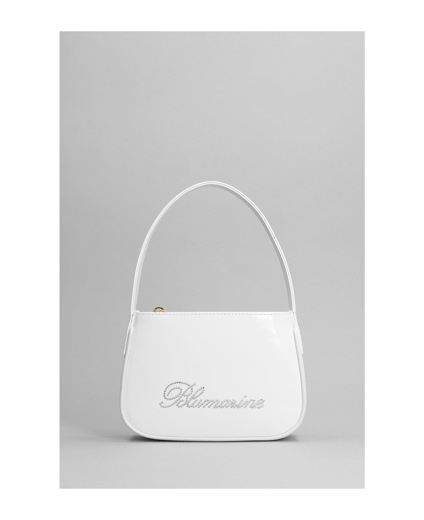Hand bag in white patent leather, Width 190 mm, handle, zip clousure, front logo, crystals detail, Made in Italy, Height 135 mm, patent leather