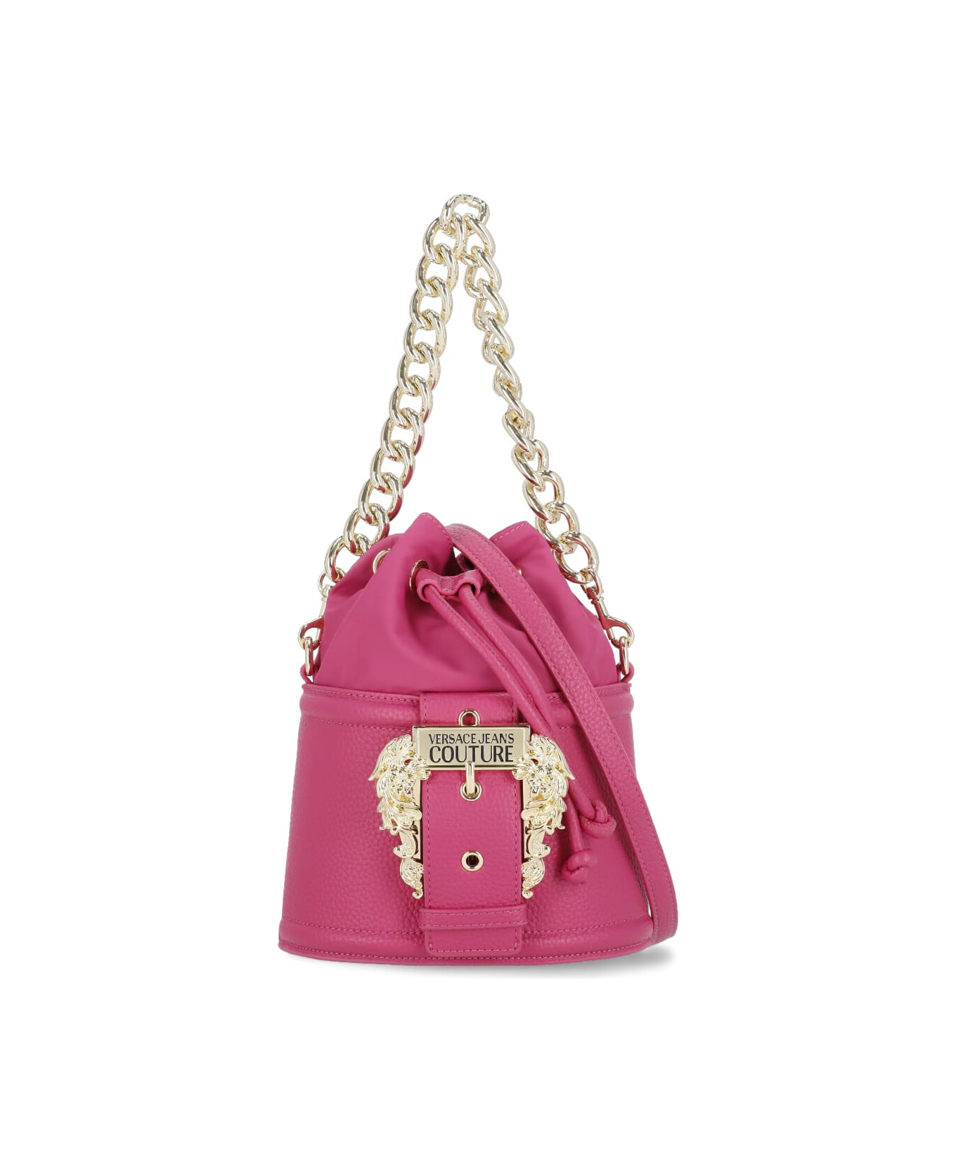 - Fucsia Versace Jeans Couture handbag for woman - One removible chain handle - One regolable and adjustable shoulder bag - One internal welt pocket - One internal pocket with zip fastening - One main compartment with deawstring fastening - Front metal Baroque buckle detail