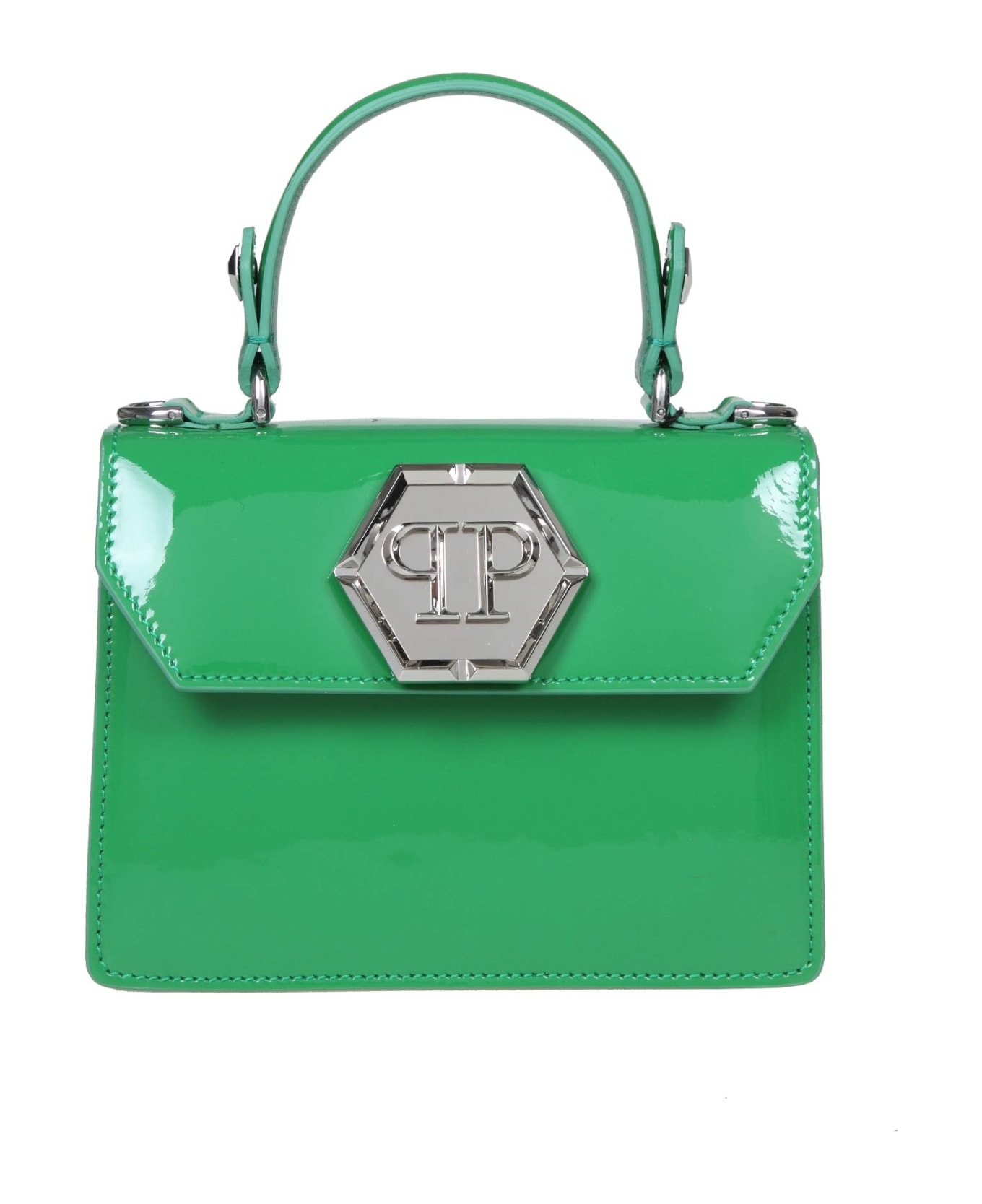 Patent leather handbag green colour leather handle flap closure adjustable and removable patent leather shoulder strap one small internal slit pocket leather interior buckle with logo composition 100% leather measures: width 17. 5cm height 13. 5cm depth 7cm made in italy
