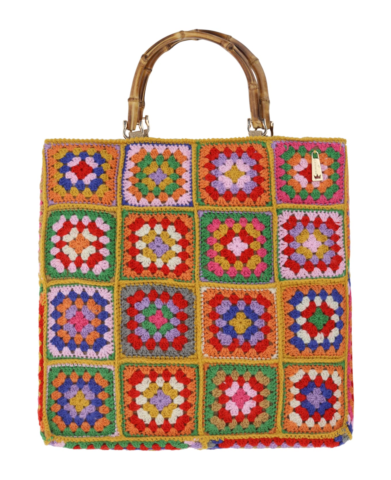 Wool handbag by la milanesa, multicolored crochet pattern, double bamboo handle, iconic brand monogram embroidered inside, single interior compartment.