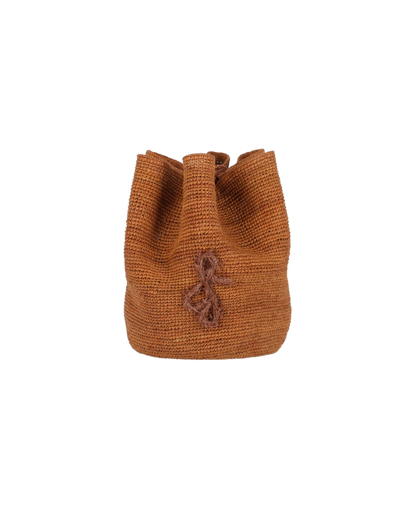 Ruslan Baginskiy 'Hatbag' bag in brown raffia with leather trim, woven pattern, hat convertible design, shoulder strap, tone-on-tone logo embroidery on the front, single inner compartment. Composition: 100% Raffia