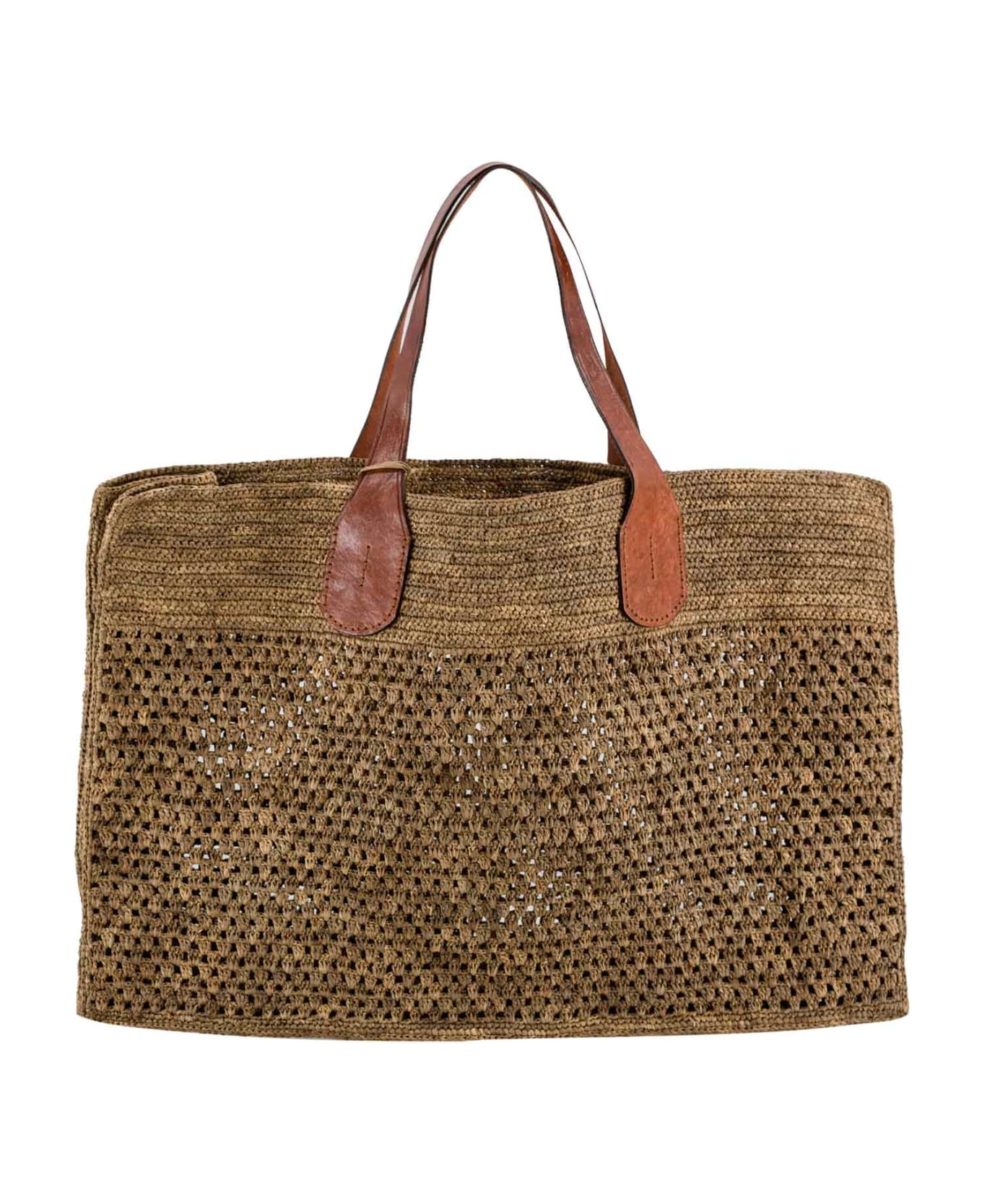 Havana raffia tote bag from IBELIV featuring brown, raffia, leather, interwoven design, open top, two top handles, main compartment, internal logo tag and dark tea beige. Composition: Rafia, 100% , Crosta, 100%