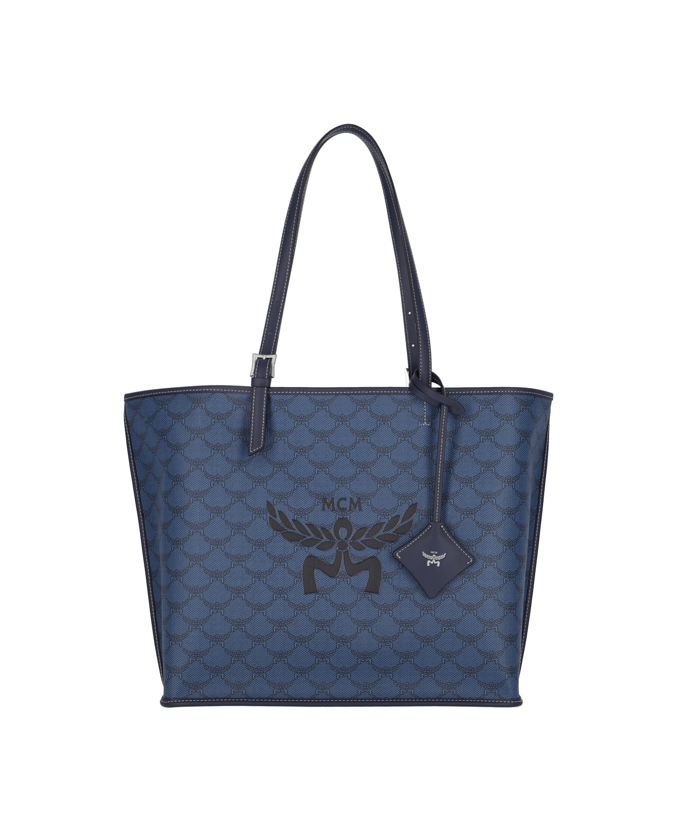 MCM medium Himmel tote bag in navy blue Lauretos faux leather with black nappa leather details, all-over black logo print pattern, two adjustable top handles, removable Bavarian Diamond logo charm detail, embossed logo appliqué on the front, main inner compartment, and removable tone-on-tone zip pouch.