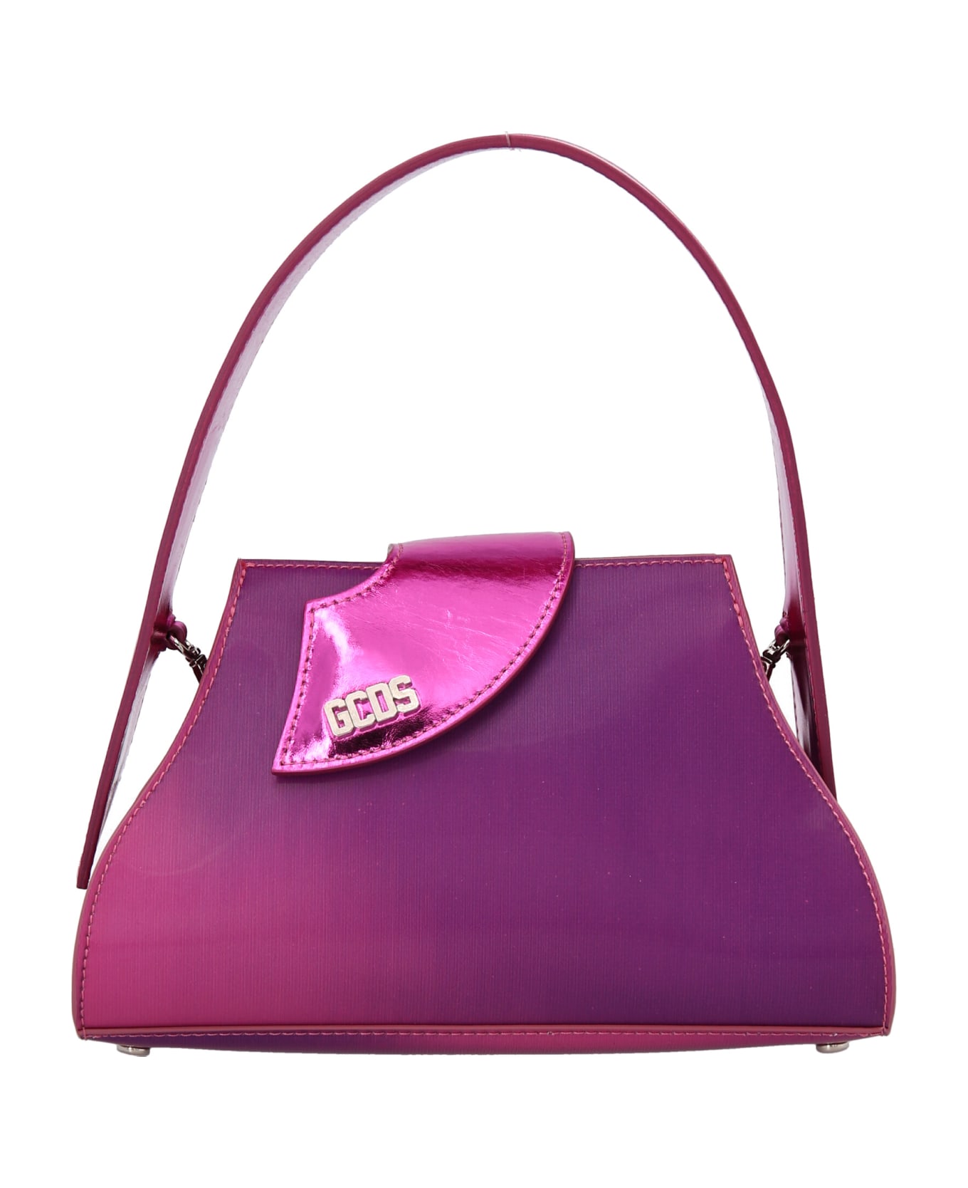 Holographic fabric handbag with particular flared shape, magnetic closure with asymmetric curved flap with metal logo, removable leather handle and a removable leather shoulder strap.
