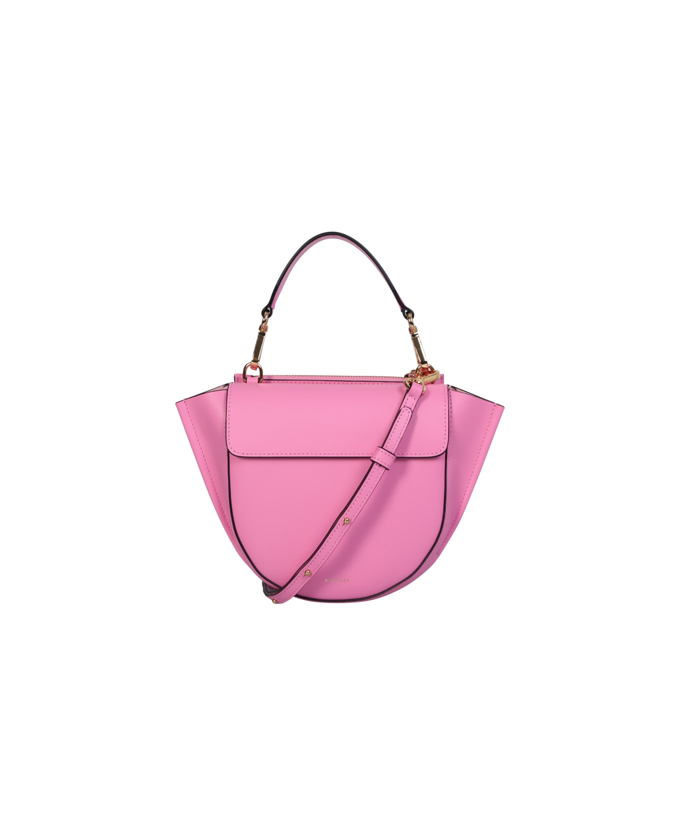Magnetic fastening. Main compartment. Slip pocket to the rear. Single detachable top handle. Curved edge. Gold-tone lettering. Gold-tone hardware. Colore: pink