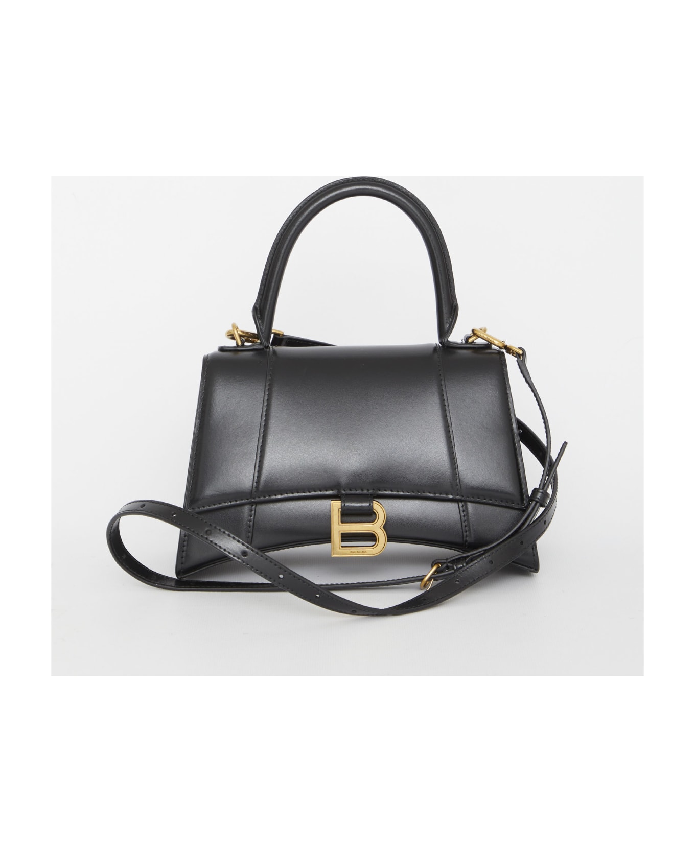 Small Hourglass bag in black shiny calfskin. It features hourglass design, front flap with magnetic closure and B logo in antique gold, top handle, adjustable and detachable shoulder strap, one rear flat pocket, one main interior compartment and one interior zip pocket.