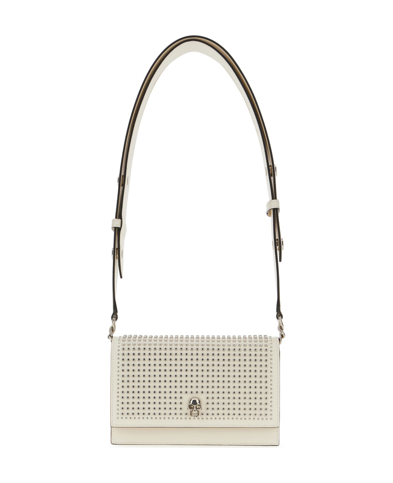 Shoulder bag realizzata in smooth leather enriched by studs on the entire surface and metal Skull detail at the front. -Adjustable tonal leather shoulder strap -Magnetic button closure under the flap -Lined interior with a credit card slot Composition: Exterior: 100% Leather Lining: 100% Leather Finish: Silver metal