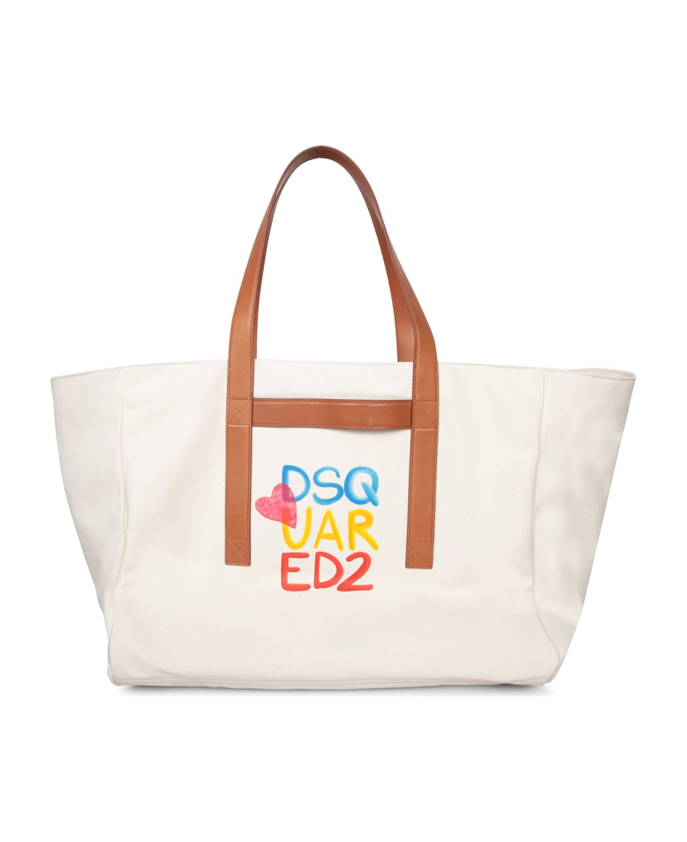 This chic DSQUARED2 ivory shopping bag features a roomy design with convenient brown leather handles and a vibrant colored logo on the front, perfect for a casual yet sophisticated look.