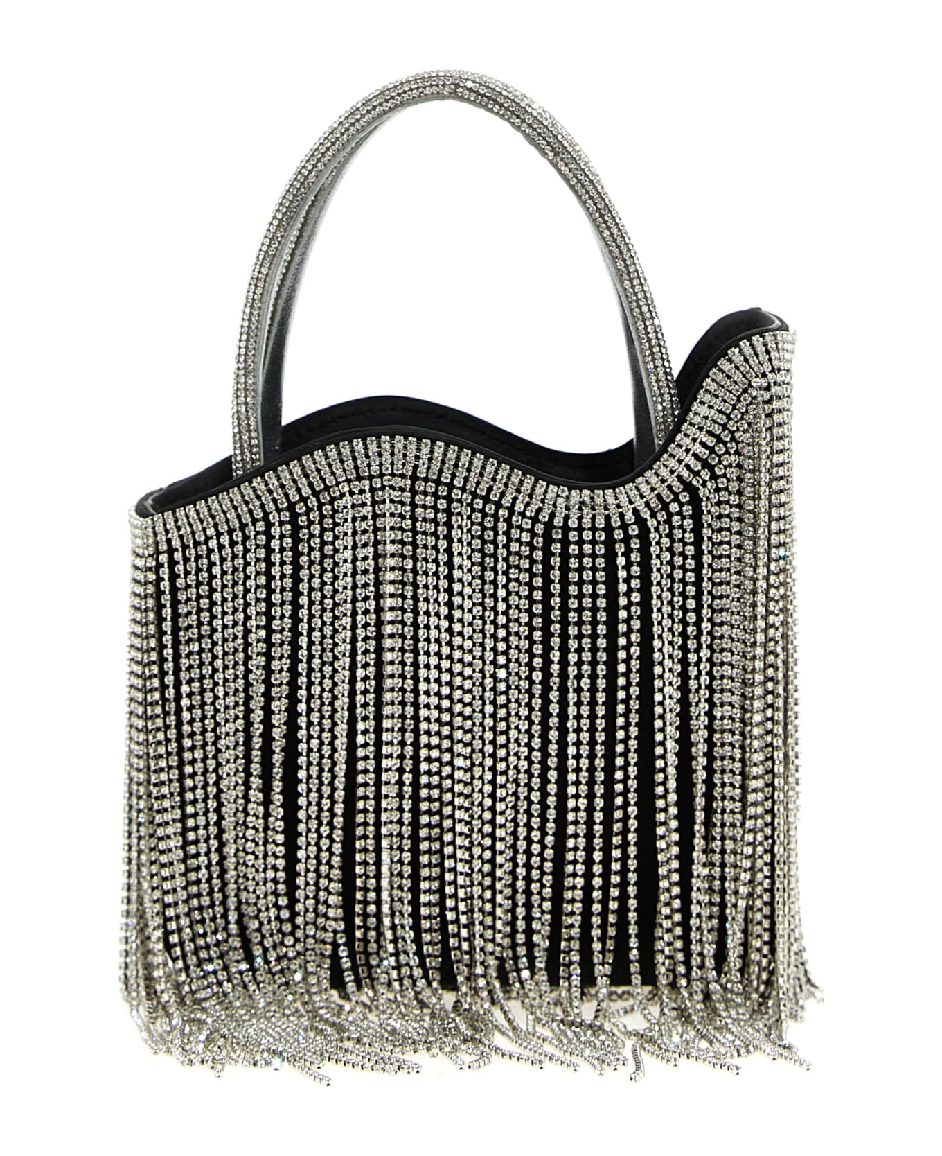 Ivy' satin handbag with crystal appliqués and all-over pendants, a double leather handle with crystals, a magnetic closure, an adjustable and removable shoulder strap.
