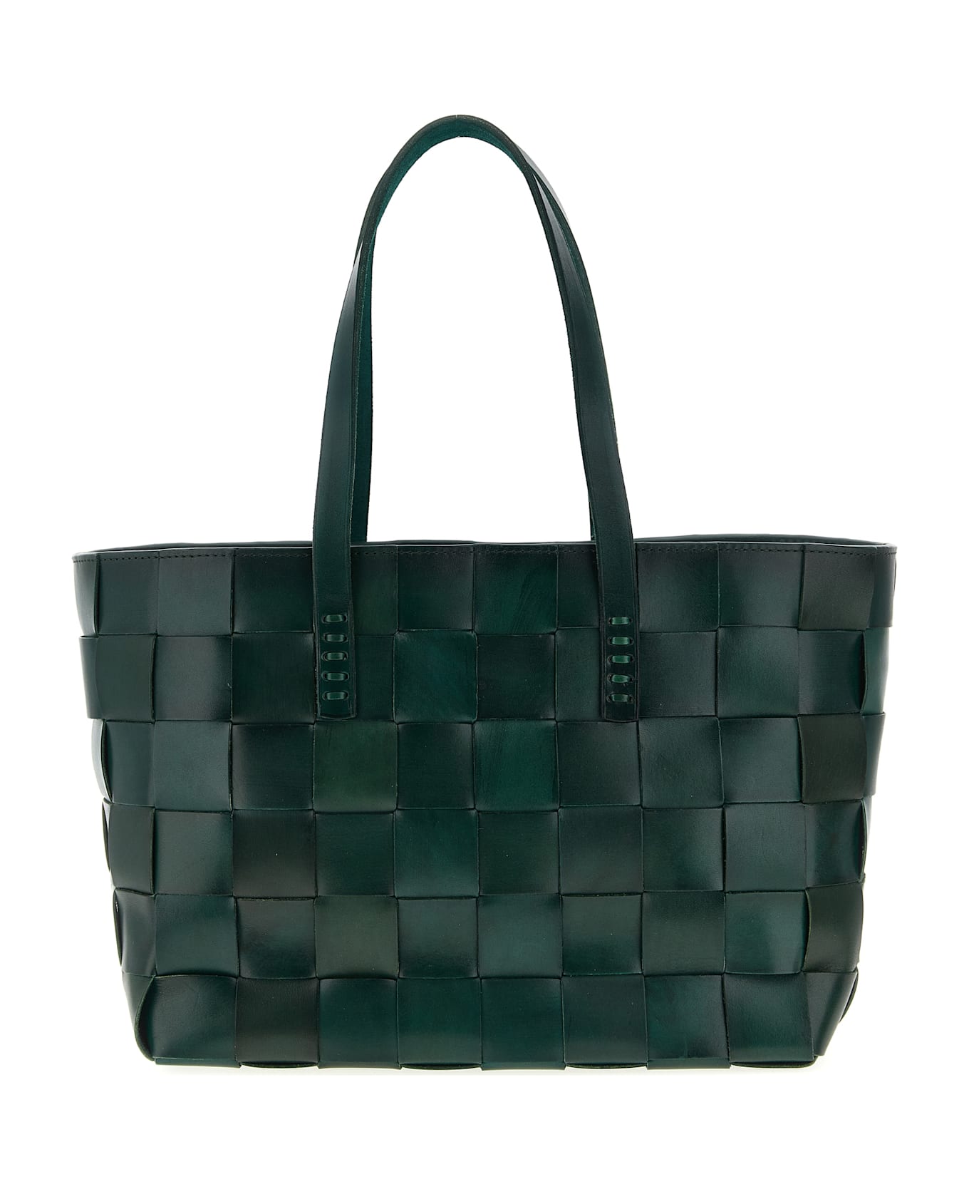 'Japan Tote' hand-woven buffalo leather shopping bag, cotton lining, double fixed handle. An antiqued St. Christopher medal-shaped pendant, in homage to the patron saint of travelers, is hand-sewn inside each bag Dragon Diffusion the brand's seal of authenticity.