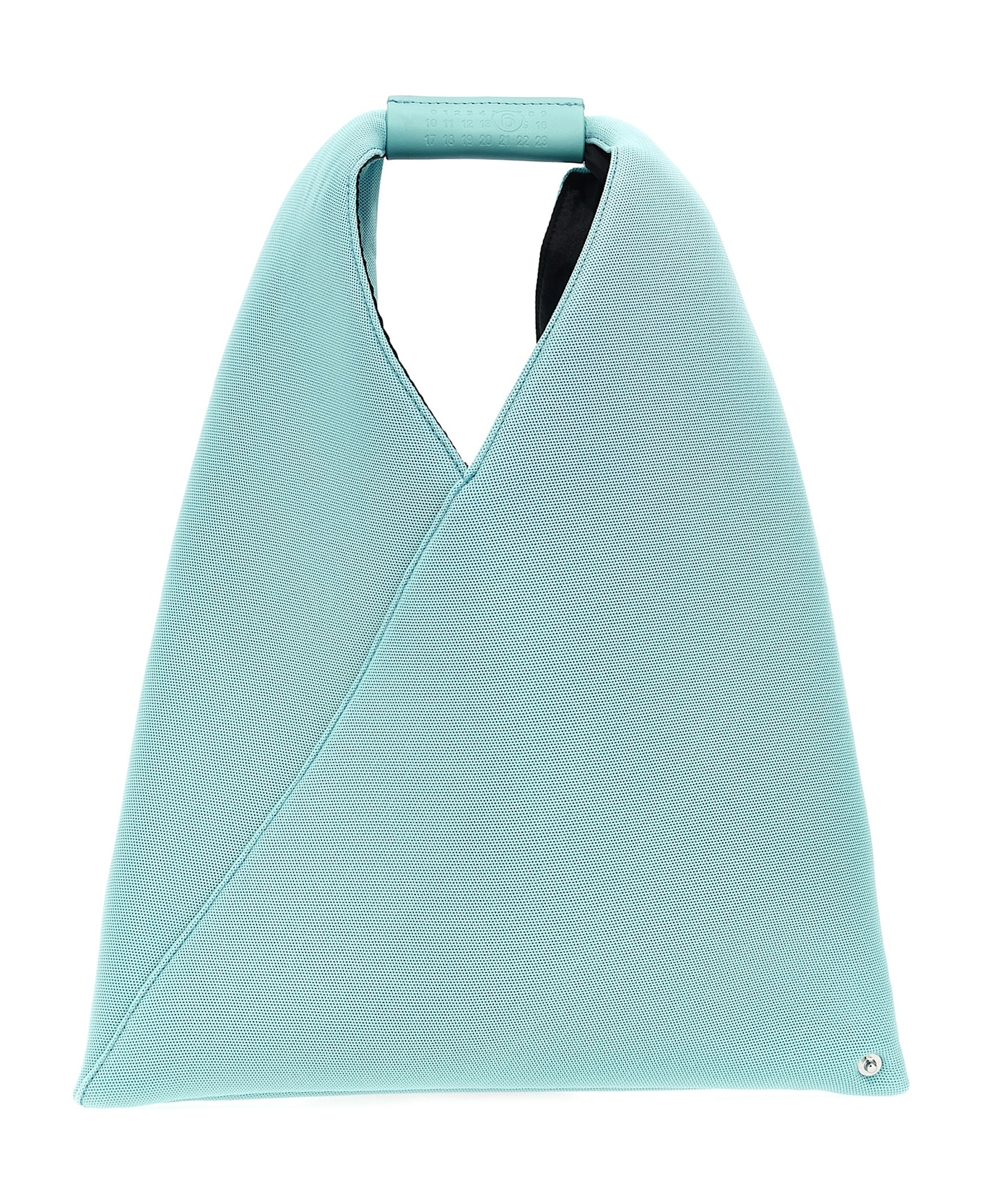 'Japanese Classic Small' mesh handbag, leather handle with embossed 'Numeric Signature MM6', two snap buttons on the edge to change the shape, 'White Stitch Line' at the back, snap button closure.