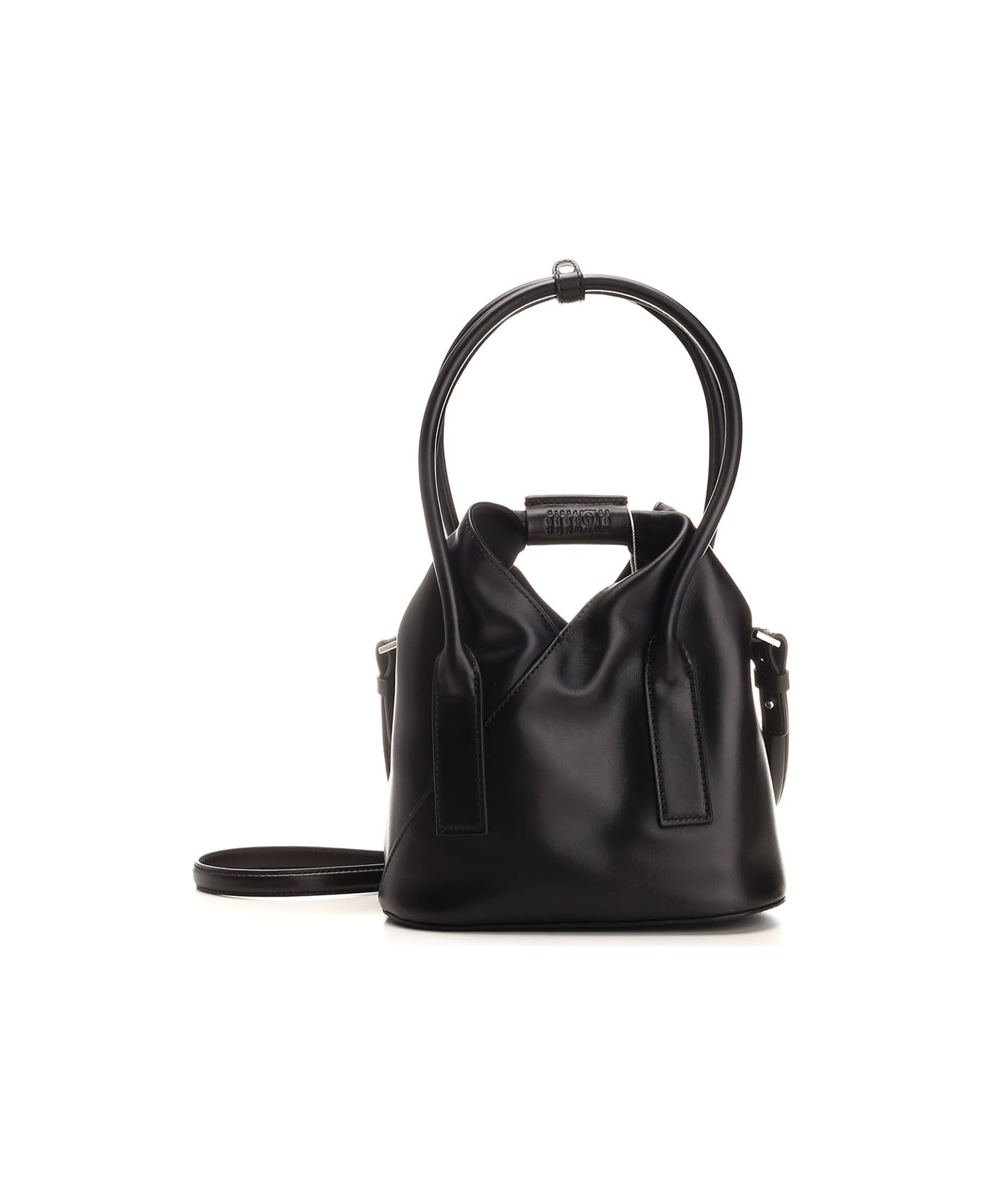 'Japanese' handbag in black leatherby MM6 Maison Margiela. Triangular silhouette is inspired by the traditional Japanese technique of origami. The buttons on the edges allow the bag to change shape by folding it in different ways, a reference to the deconstructionist aesthetic code of the Maison. Three top handles, adjustable shoulder strap with iconic white stitching, snap button closure and one main internal compartment. Composition: T1 100% PBV - T2 100% CO - T3 94% ZN 4% ALL 2% RME
