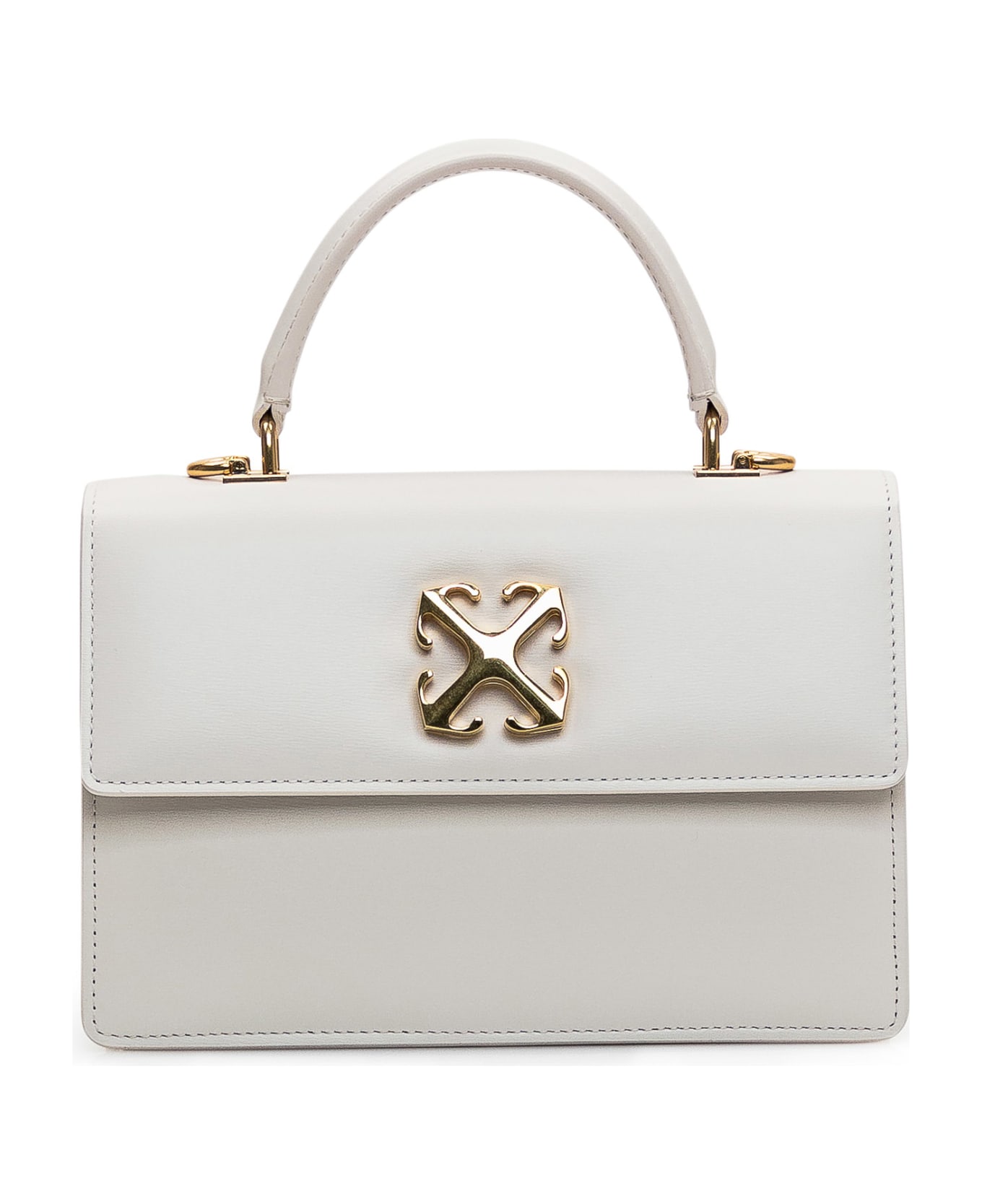 White leather handbag. One handle. Adjustable and removable shoulder strap. Inside zip pocket. Flat pocket on the back. Flap closure with Arrow pattern. Logo on the back.